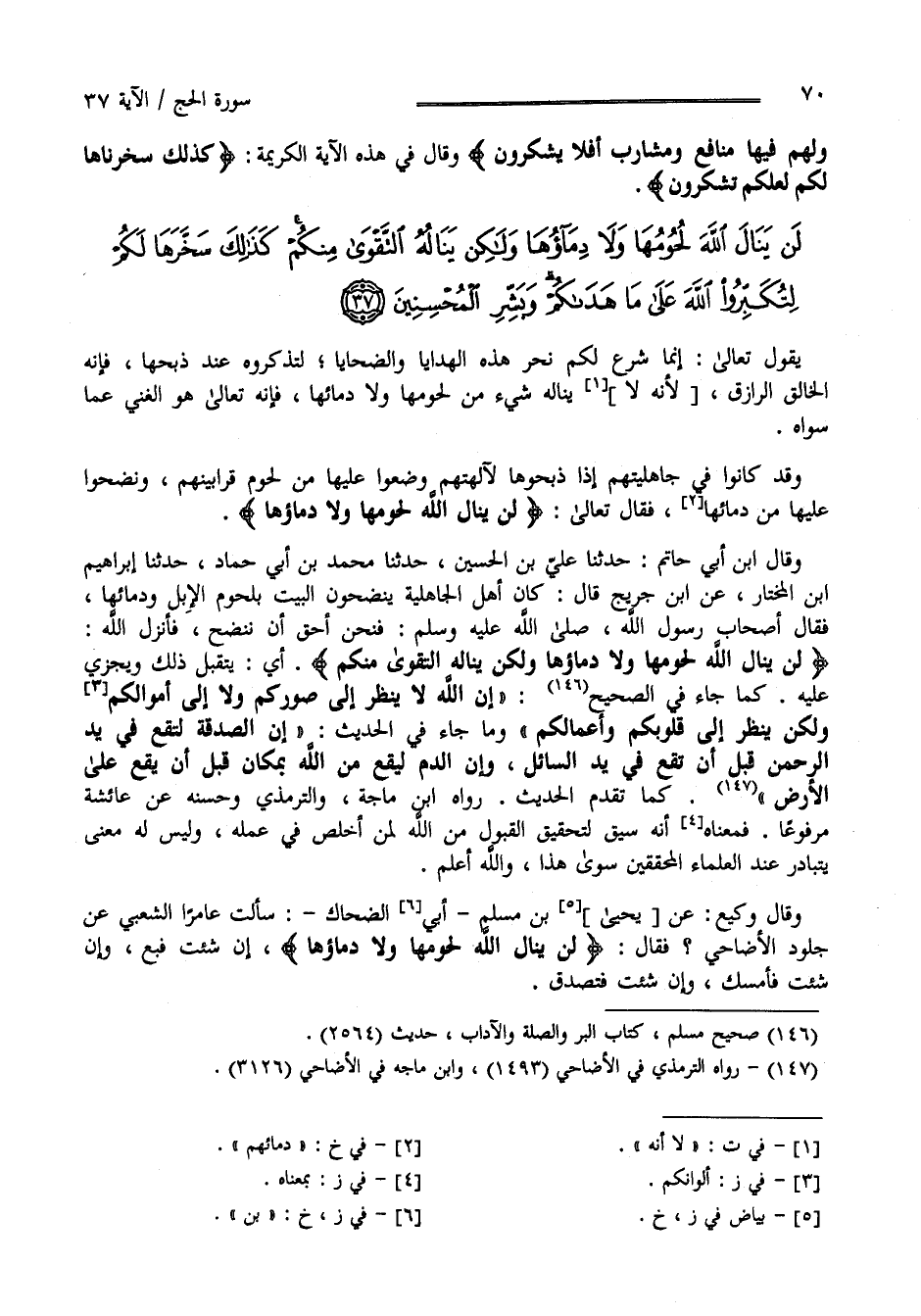 لَنْ يَنَالَ اللَّهَ لُحُومُهَا وَلَا دِمَاؤُهَا وَلَكِنْ يَنَالُهُ التَّقْوَى مِنْكُمْ كَذَلِكَ سَخَّرَهَا لَكُمْ لِتُكَبِّرُوا اللَّهَ عَلَى مَا هَدَاكُمْ وَبَشِّرِ الْمُحْسِنِينَ