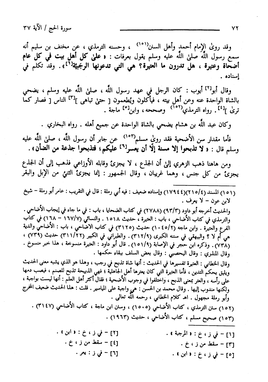 : وَقَدْ رَوَى الْإِمَام أَحْمَد وَأَهْل السُّنَن وَحَسَّنَهُ التِّرْمِذِيّ عَنْ مِحْنَف بْن سُلَيْم أَنَّهُ سَمِعَ رَسُول اللَّه صَلَّى اللَّه عَلَيْهِ وَسَلَّمَ يَقُول بِعَرَفَاتٍ " عَلَى كُلّ أَهْل بَيْت فِي كُلّ عَام أُضْحِيَّة وَعَتِيرَة هَلْ تَدْرُونَ مَا الْعَتِيرَة ؟ هِيَ الَّتِي تَدْعُونَهَا الرَّجَبِيَّة" وَقَدْ تُكُلِّمَ فِي إِسْنَاده وَقَالَ أَبُو أَيُّوب كَانَ الرَّجُل فِي عَهْد رَسُول اللَّه صَلَّى اللَّه عَلَيْهِ وَسَلَّمَ يُضَحِّي بِالشَّاةِ الْوَاحِدَة عَنْهُ وَعَنْ أَهْل بَيْته فَيَأْكُلُونَ وَيُطْعِمُونَ حَتَّى تَبَاهَى النَّاس فَصَارَ كَمَا تَرَى رَوَاهُ التِّرْمِذِيّ وَصَحَّحَهُ وَابْن مَاجَهْ وَكَانَ عَبْد اللَّه بْن هِشَام يُضَحِّي بِالشَّاةِ الْوَاحِدَة عَنْ جَمِيع أَهْله رَوَاهُ الْبُخَارِيّ وَأَمَّا مِقْدَار سِنّ الْأُضْحِيَّة فَقَدْ رَوَى مُسْلِم عَنْ جَابِر أَنَّ رَسُول اللَّه صَلَّى اللَّه عَلَيْهِ وَسَلَّمَ قَالَ " لَا تَذْبَحُوا إِلَّا مُسِنَّة إِلَّا أَنْ تَعْسُر عَلَيْكُمْ فَتَذْبَحُوا جَذَعَة مِنْ الضَّأْن " وَمِنْ هَهُنَا ذَهَبَ الزُّهْرِيّ إِلَى أَنَّ الْجَذَع لَا يُجْزِئ وَقَابَلَهُ الْأَوْزَاعِيّ فَذَهَبَ إِلَى أَنَّ الْجَذَعَ يُجْزِئ مِنْ كُلّ جِنْس وَهُمَا غَرِيبَانِ وَاَلَّذِي عَلَيْهِ الْجُمْهُور إِنَّمَا يُجْزِئ الثَّنِيّ مِنْ الْإِبِل وَالْبَقَر
