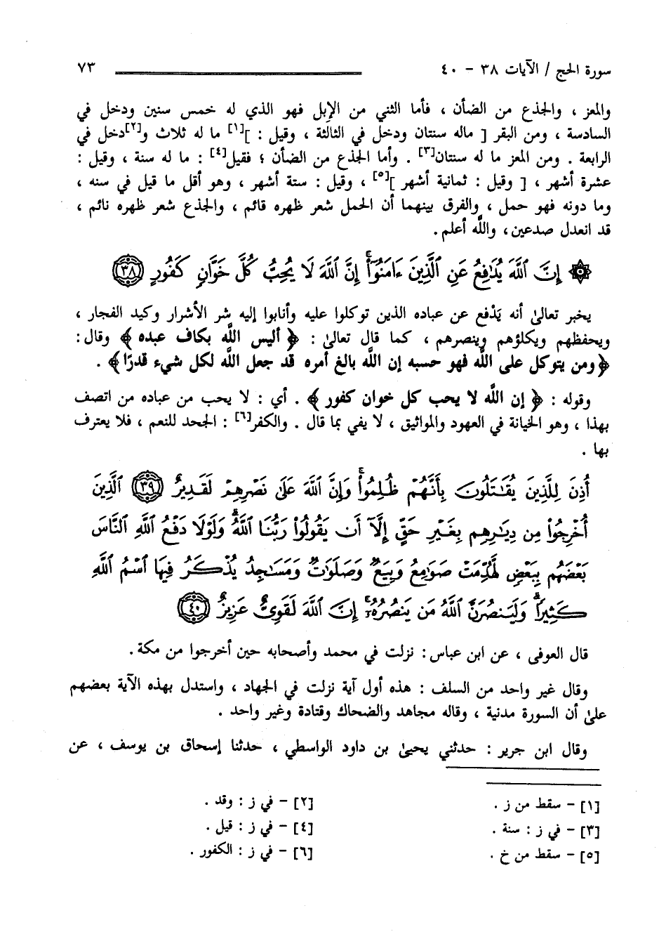 قَالَ الْعَوْفِيّ عَنْ اِبْن عَبَّاس نَزَلَتْ فِي مُحَمَّد وَأَصْحَابه حِين أُخْرِجُوا مِنْ مَكَّة وَقَالَ مُجَاهِد وَالضَّحَّاك وَغَيْر وَاحِد مِنْ السَّلَف كَابْنِ عَبَّاس وَعُرْوَة بْن الزُّبَيْر وَزَيْد بْن أَسْلَم وَمُقَاتِل بْن حَيَّان وَقَتَادَة وَغَيْرهمْ هَذِهِ أَوَّل آيَة نَزَلَتْ فِي الْجِهَاد وَاسْتَدَلَّ بِهَذِهِ الْآيَة بَعْضهمْ عَلَى أَنَّ السُّورَة مَدَنِيَّة وَقَالَ اِبْن جَرِير حَدَّثَنِي يَحْيَى بْن دَاوُد الْوَاسِطِيّ حَدَّثَنَا إِسْحَاق بْن يُوسُف عَنْ