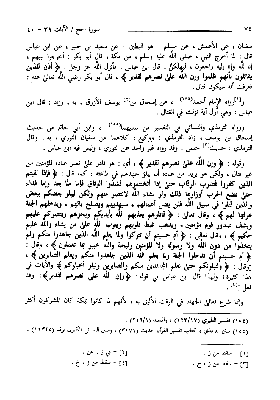 وَرَوَاهُ الْإِمَام أَحْمَد عَنْ إِسْحَاق بْن يُوسُف الْأَزْرَق بِهِ وَزَادَ قَالَ اِبْن عَبَّاس وَهِيَ أَوَّل آيَة نَزَلَتْ فِي الْقِتَال رَوَاهُ التِّرْمِذِيّ وَالنَّسَائِيّ فِي التَّفْسِير مِنْ سُنَنَيْهِمَا وَابْن أَبِي حَاتِم مِنْ حَدِيث إِسْحَاق بْن يُوسُف زَادَ التِّرْمِذِيّ وَوَكِيع كِلَاهُمَا عَنْ سُفْيَان الثَّوْرِيّ بِهِ وَقَالَ التِّرْمِذِيّ حَدِيث حَسَن وَقَدْ رَوَاهُ غَيْر وَاحِد عَنْ الثَّوْرِيّ وَلَيْسَ فِيهِ اِبْن عَبَّاس وَقَوْله" وَإِنَّ اللَّه عَلَى نَصْرهمْ لَقَدِير " أَيْ هُوَ قَادِر عَلَى نَصْر عِبَاده الْمُؤْمِنِينَ مِنْ غَيْر قِتَال وَلَكِنْ هُوَ يُرِيد مِنْ عِبَاده أَنْ يَبْذُلُوا جَهْدهمْ فِي طَاعَته كَمَا قَالَ " فَإِذَا لَقِيتُمْ الَّذِينَ كَفَرُوا فَضَرْب الرِّقَاب حَتَّى إِذَا أَثْخَنْتُمُوهُمْ فَشُدُّوا الْوَثَاق فَإِمَّا مَنًّا بَعْد وَإِمَّا فِدَاء حَتَّى تَضَع الْحَرْب أَوْزَارهَا ذَلِكَ وَلَوْ يَشَاء اللَّه لَانْتَصَرَ مِنْهُمْ وَلَكِنْ لِيَبْلُوَ بَعْضكُمْ بِبَعْضٍ وَاَلَّذِينَ قُتِلُوا فِي سَبِيل اللَّه فَلَنْ يُضِلّ أَعْمَالهمْ سَيَهْدِيهِمْ وَيُصْلِح بَالهمْ وَيُدْخِلهُمْ الْجَنَّة عَرَّفَهَا لَهُمْ " وَقَالَ تَعَالَى " قَاتِلُوهُمْ يُعَذِّبهُمْ اللَّه بِأَيْدِيكُمْ وَيُخْزِهِمْ وَيَنْصُركُمْ عَلَيْهِمْ وَيَشْفِ صُدُور قَوْم مُؤْمِنِينَ وَيُذْهِب غَيْظ قُلُوبهمْ وَيَتُوب اللَّه عَلَى مَنْ يَشَاء وَاَللَّه عَلِيم حَكِيم " وَقَالَ " أَمْ حَسِبْتُمْ أَنْ تُتْرَكُوا وَلَمَّا يَعْلَم اللَّه الَّذِينَ جَاهَدُوا مِنْكُمْ وَلَمْ يَتَّخِذُوا مِنْ دُون اللَّه وَلَا رَسُوله وَلَا الْمُؤْمِنِينَ وَلِيجَة وَاَللَّه خَبِير بِمَا تَعْمَلُونَ " وَقَالَ " أَمْ حَسِبْتُمْ أَنْ تَدْخُلُوا الْجَنَّة وَلَمَّا يَعْلَم اللَّه الَّذِينَ جَاهَدُوا مِنْكُمْ وَيَعْلَم الصَّابِرِينَ " وَقَالَ " ولَنَبْلُوَنَّكُمْ حَتَّى نَعْلَم الْمُجَاهِدِينَ مِنْكُمْ وَالصَّابِرِينَ وَنَبْلُو أَخْبَاركُمْ" وَالْآيَات فِي هَذَا كَثِيرَة وَلِهَذَا قَالَ اِبْن عَبَّاس فِي قَوْله " وَإِنَّ اللَّه عَلَى نَصْرهمْ لَقَدِير " وَقَدْ فَعَلَ وَإِنَّمَا شَرَعَ تَعَالَى الْجِهَاد فِي الْوَقْت الْأَلْيَق بِهِ لِأَنَّهُمْ لَمَّا كَانُوا بِمَكَّة كَانَ الْمُشْرِكُونَ أَكْثَر