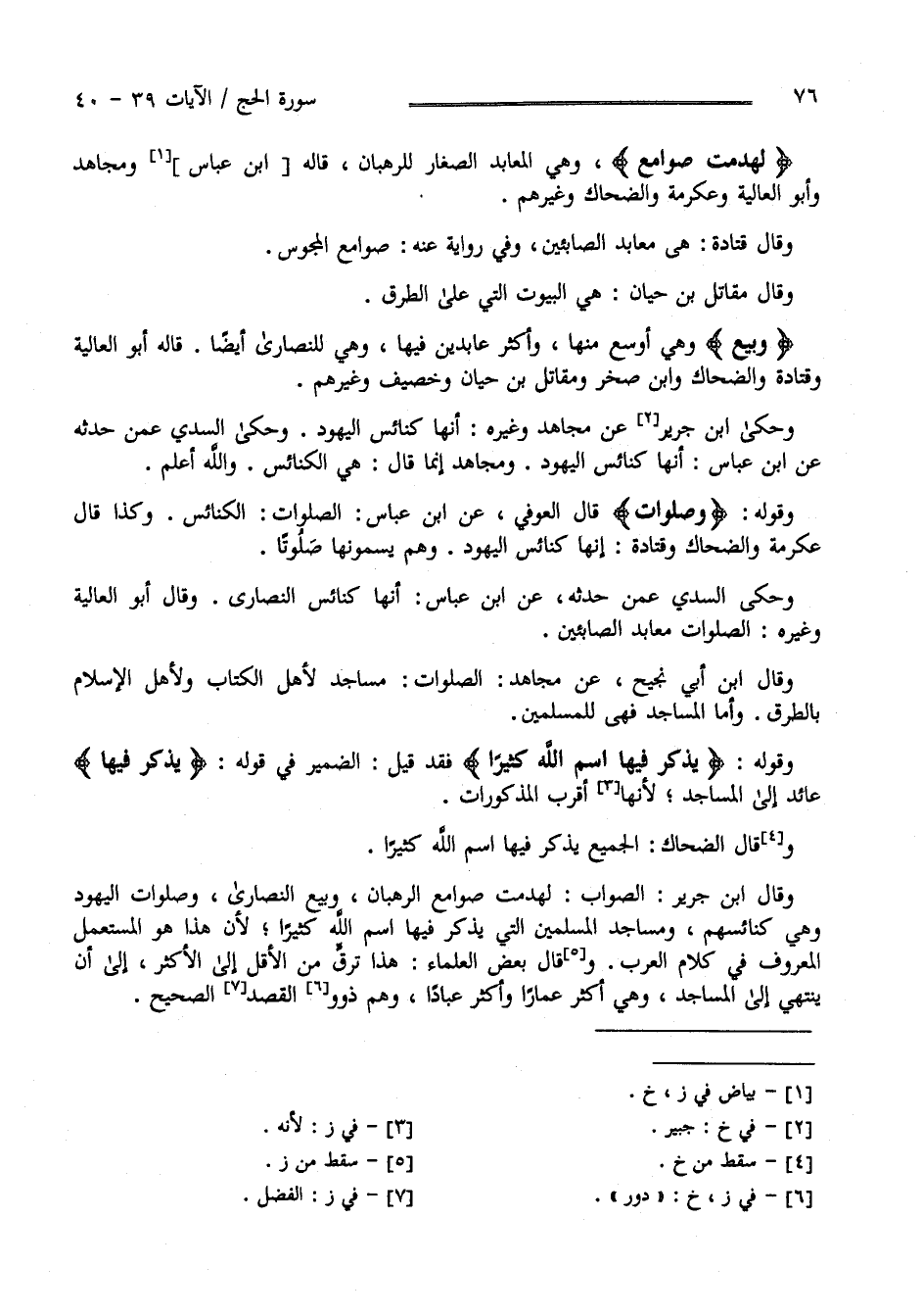 لَهُدِّمَتْ صَوَامِع " وَهِيَ الْمَعَابِد الصِّغَار لِلرُّهْبَانِ قَالَهُ اِبْن عَبَّاس وَمُجَاهِد وَأَبُو الْعَالِيَة وَعِكْرِمَة وَالضَّحَّاك وَغَيْرهمْ وَقَالَ قَتَادَة هِيَ مَعَابِد الصَّابِئِينَ وَفِي رِوَايَة عَنْهُ صَوَامِع الْمَجُوس وَقَالَ مُقَاتِل بْن حَيَّان هِيَ الْبُيُوت الَّتِي عَلَى الطُّرُق" وَبِيَع " وَهِيَ أَوْسَع مِنْهَا وَأَكْثَر عَابِدِينَ فِيهَا وَهِيَ لِلنَّصَارَى أَيْضًا قَالَهُ أَبُو الْعَالِيَة وَقَتَادَة وَالضَّحَّاك وَابْن صَخْر وَمُقَاتِل بْن حَيَّان وَخُصَيْف وَغَيْرهمْ وَحَكَى اِبْن جُبَيْر عَنْ مُجَاهِد وَغَيْره أَنَّهَا كَنَائِس الْيَهُود وَحَكَى السُّدِّيّ عَمَّنْ حَدَّثَهُ عَنْ اِبْن عَبَّاس أَنَّهَا كَنَائِس الْيَهُود وَمُجَاهِد إِنَّمَا قَالَ هِيَ الْكَنَائِس وَاَللَّه أَعْلَم وَقَوْله " وَصَلَوَات " قَالَ الْعَوْفِيّ عَنْ اِبْن عَبَّاس الصَّلَوَات الْكَنَائِس وَكَذَا قَالَ عِكْرِمَة وَالضَّحَّاك وَقَتَادَة : إِنَّهَا كَنَائِس الْيَهُود وَهُمْ يُسَمُّونَهَا صَلَوَات وَحَكَى السُّدِّيّ عَمَّنْ حَدَّثَهُ عَنْ اِبْن عَبَّاس أَنَّهَا كَنَائِس النَّصَارَى وَقَالَ أَبُو الْعَالِيَة وَغَيْره الصَّلَوَات مَعَابِد الصَّابِئِينَ وَقَالَ اِبْن أَبِي نَجِيح عَنْ مُجَاهِد الصَّلَوَات مَسَاجِد لِأَهْلِ الْكِتَاب وَلِأَهْلِ الْإِسْلَام بِالطُّرُقِ وَأَمَّا الْمَسَاجِد فَهِيَ لِلْمُسْلِمِينَ وَقَوْله " يُذْكَر فِيهَا اِسْم اللَّه كَثِيرًا" فَقَدْ قِيلَ الضَّمِير فِي قَوْله يُذْكَر فِيهَا عَائِد إِلَى الْمَسَاجِد لِأَنَّهَا أَقْرَب الْمَذْكُورَات وَقَالَ الضَّحَّاك الْجَمِيع يُذْكَر فِيهَا اِسْم اللَّه كَثِيرًا وَقَالَ اِبْن جَرِير الصَّوَاب لَهُدِّمَتْ صَوَامِع الرُّهْبَان وَبِيَع النَّصَارَى وَصَلَوَات الْيَهُود وَهِيَ كَنَائِسهمْ وَمَسَاجِد الْمُسْلِمِينَ الَّتِي يُذْكَر فِيهَا اِسْم اللَّه كَثِيرًا لِأَنَّ هَذَا هُوَ الْمُسْتَعْمَل الْمَعْرُوف فِي كَلَام الْعَرَب وَقَالَ بَعْض الْعُلَمَاء هَذَا تَرَقٍّ مِنْ الْأَقَلّ إِلَى الْأَكْثَر إِلَى أَنْ اِنْتَهَى إِلَى الْمَسَاجِد وَهِيَ أَكْثَر عَمَارًا وَأَكْثَر عِبَادًا وَهُمْ ذَوُو الْقَصْد الصَّحِيح