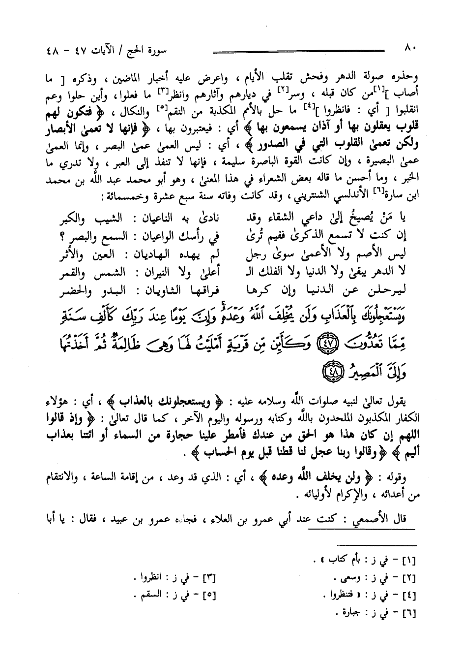 وَيَسْتَعْجِلُونَكَ بِالْعَذَابِ وَلَنْ يُخْلِفَ اللَّهُ وَعْدَهُ وَإِنَّ يَوْمًا عِنْدَ رَبِّكَ كَأَلْفِ سَنَةٍ مِمَّا تَعُدُّونَ (47)