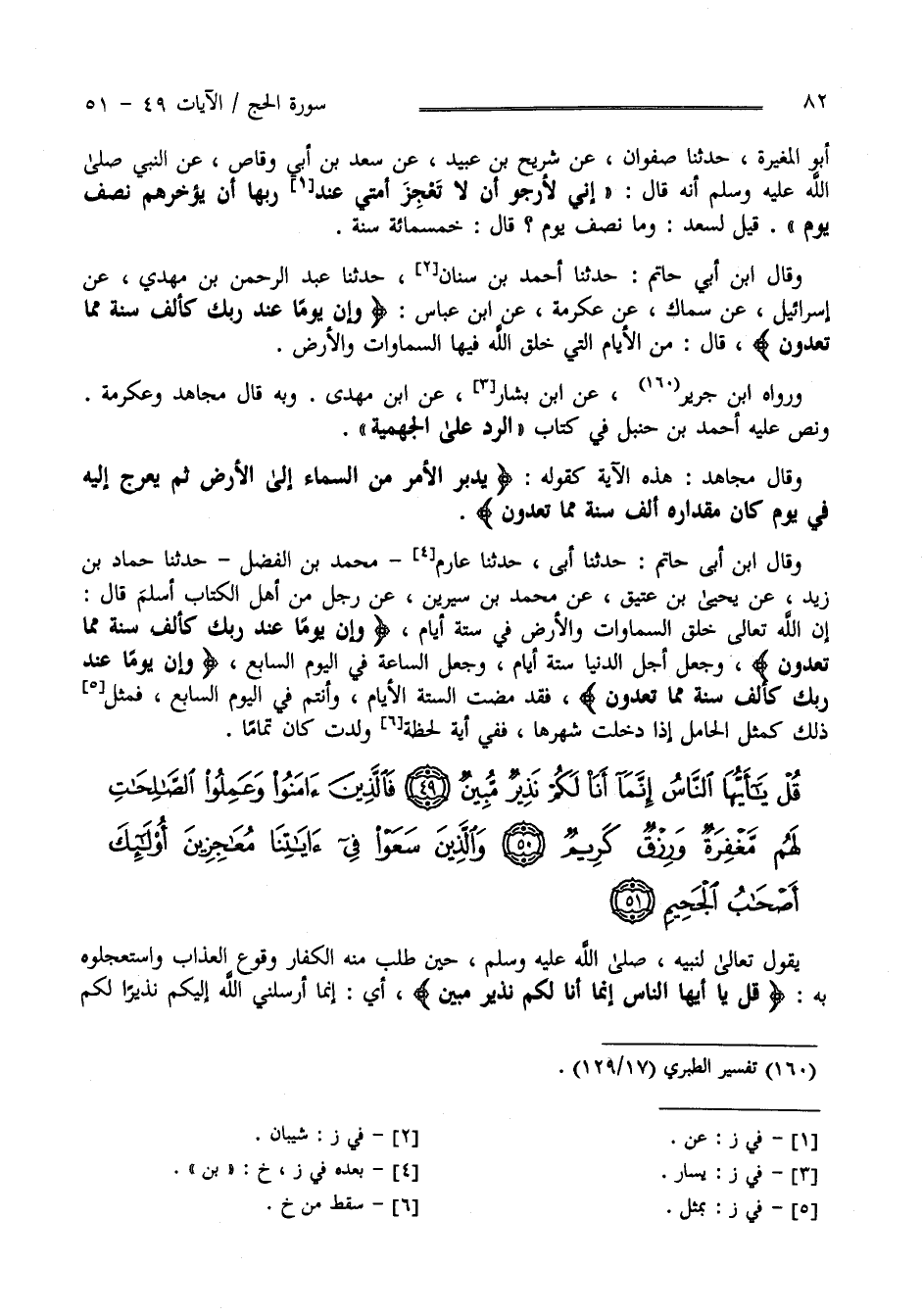 وَقَالَ اِبْن أَبِي حَاتِم حَدَّثَنَا أَحْمَد بْن سِنَان حَدَّثَنَا عَبْد الرَّحْمَن بْن مَهْدِيّ عَنْ إِسْرَائِيل عَنْ سِمَاك عَنْ عِكْرِمَة عَنْ اِبْن عَبَّاس" وَإِنَّ يَوْمًا عِنْد رَبّك كَأَلْفِ سَنَة مِمَّا تَعُدُّونَ " قَالَ مِنْ الْأَيَّام الَّتِي خَلَقَ اللَّه فِيهَا السَّمَوَات وَالْأَرْض وَرَوَاهُ اِبْن جَرِير عَنْ اِبْن بَشَّار عَنْ اِبْن الْمَهْدِيّ وَبِهِ قَالَ مُجَاهِد وَعِكْرِمَة وَنَصَّ عَلَيْهِ أَحْمَد بْن حَنْبَل فِي كِتَاب الرَّدّ عَلَى الْجَهْمِيَّة وَقَالَ مُجَاهِد هَذِهِ الْآيَة كَقَوْلِهِ " يُدَبِّر الْأَمْر مِنْ السَّمَاء إِلَى الْأَرْض ثُمَّ يَعْرُج إِلَيْهِ فِي يَوْم كَانَ مِقْدَاره أَلْف سَنَة مِمَّا تَعُدُّونَ" وَقَالَ اِبْن أَبِي حَاتِم : حَدَّثَنَا أَبِي حَدَّثَنَا عَارِم بْن مُحَمَّد بْن الْفَضْل حَدَّثَنَا حَمَّاد بْن زَيْد عَنْ يَحْيَى بْن عَتِيق عَنْ مُحَمَّد بْن سِيرِينَ عَنْ رَجُل مِنْ أَهْل الْكِتَاب أَسْلَمَ قَالَ : إِنَّ اللَّه تَعَالَى خَلَقَ السَّمَوَات وَالْأَرْض فِي سِتَّة أَيَّام " وَإِنَّ يَوْمًا عِنْد رَبّك كَأَلْفِ سَنَة مِمَّا تَعُدُّونَ " وَجَعَلَ أَجَل الدُّنْيَا سِتَّة أَيَّام وَجَعَلَ السَّاعَة فِي الْيَوْم السَّابِع " وَإِنَّ يَوْمًا عِنْد رَبّك كَأَلْفِ سَنَة مِمَّا تَعُدُّونَ " فَقَدْ مَضَتْ السِّتَّة أَيَّام وَأَنْتُمْ فِي الْيَوْم السَّابِع فَمَثَل ذَلِكَ كَمَثَلِ الْحَامِل إِذَا دُلَّتْ شَهْرهَا فَفِي أَيَّة لَحْظَة وَلَدَتْ كَانَ تَمَامًا .