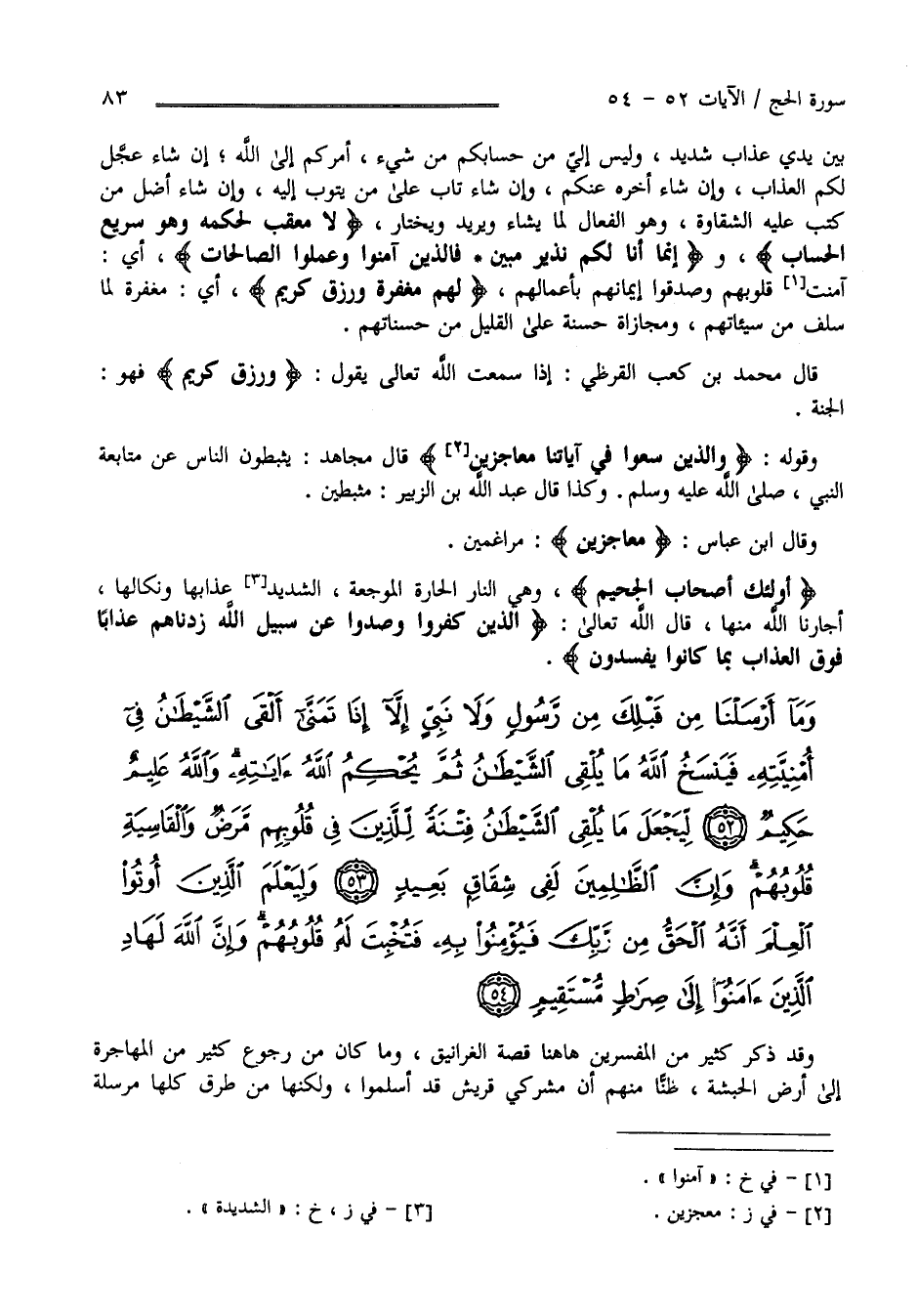 وَمَا أَرْسَلْنَا مِنْ قَبْلِكَ مِنْ رَسُولٍ وَلَا نَبِيٍّ إِلَّا إِذَا تَمَنَّى أَلْقَى الشَّيْطَانُ فِي أُمْنِيَّتِهِ فَيَنْسَخُ اللَّهُ مَا يُلْقِي الشَّيْطَانُ ثُمَّ يُحْكِمُ اللَّهُ آيَاتِهِ وَاللَّهُ عَلِيمٌ حَكِيمٌ