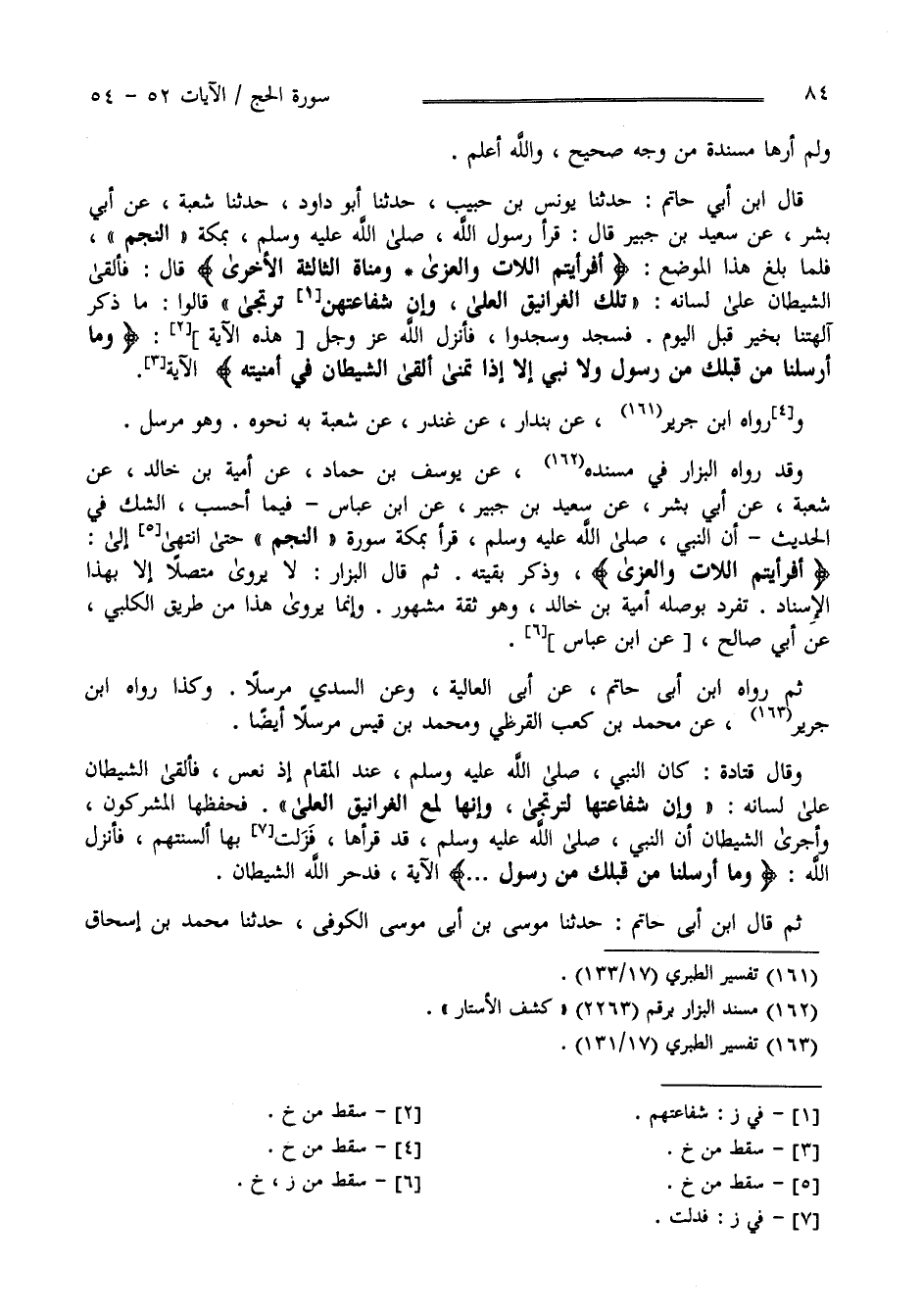 وَلَمْ أَرَهَا مُسْنَدَة مِنْ وَجْه صَحِيح وَاَللَّه أَعْلَم قَالَ اِبْن أَبِي حَاتِم حَدَّثَنَا يُونُس بْن حَبِيب حَدَّثَنَا أَبُو دَاوُد حَدَّثَنَا شُعْبَة عَنْ أَبِي بِشْر عَنْ سَعِيد بْن جُبَيْر قَالَ : قَرَأَ رَسُول اللَّه صَلَّى اللَّه عَلَيْهِ وَسَلَّمَ بِمَكَّة النَّجْم فَلَمَّا بَلَغَ هَذَا الْمَوْضِع " أَفَرَأَيْتُمْ اللَّاتَ وَالْعُزَّى وَمَنَاة الثَّالِثَة الْأُخْرَى " قَالَ فَأَلْقَى الشَّيْطَان عَلَى لِسَانه : تِلْكَ الْغَرَانِيق الْعُلَى وَإِنَّ شَفَاعَتهنَّ تُرْتَجَى قَالُوا مَا ذَكَرَ آلِهَتنَا بِخَيْرٍ قَبْل الْيَوْم فَسَجَدَ وَسَجَدُوا فَأَنْزَلَ اللَّه عَزَّ وَجَلَّ هَذِهِ الْآيَة " وَمَا أَرْسَلْنَا مِنْ قَبْلك مِنْ رَسُول وَلَا نَبِيّ إِلَّا إِذَا تَمَنَّى أَلْقَى الشَّيْطَان فِي أُمْنِيَّته فَيَنْسَخ اللَّه مَا يُلْقِي الشَّيْطَان ثُمَّ يُحْكِم اللَّه آيَاته وَاَللَّه عَلِيم حَكِيم " وَرَوَاهُ اِبْن جَرِير عَنْ بُنْدَار عَنْ غُنْدَر عَنْ شُعْبَة بِهِ بِنَحْوِهِ وَهُوَ مُرْسَل وَقَدْ رَوَاهُ الْبَزَّار فِي مُسْنَده عَنْ يُوسُف بْن حَمَّاد عَنْ أُمَيَّة بْن خَالِد عَنْ شُعْبَة عَنْ أَبِي بِشْر عَنْ سَعِيد بْن جُبَيْر عَنْ اِبْن عَبَّاس فِيمَا أَحْسَب الشَّكّ فِي الْحَدِيث أَنَّ النَّبِيّ صَلَّى اللَّه عَلَيْهِ وَسَلَّمَ قَرَأَ بِمَكَّة سُورَة النَّجْم حَتَّى اِنْتَهَى إِلَى " أَفَرَأَيْتُمْ اللَّاتَ وَالْعُزَّى " وَذَكَرَ بَقِيَّته ثُمَّ قَالَ الْبَزَّار لَا نَعْلَمهُ يُرْوَى مُتَّصِلًا إِلَّا بِهَذَا الْإِسْنَاد مُفْرَد بِوَصْلِهِ أُمَيَّة بْن خَالِد وَهُوَ ثِقَة مَسْهُور وَإِنَّمَا يُرْوَى هَذَا مِنْ طَرِيق الْكَلْبِيّ عَنْ أَبِي صَالِح عَنْ اِبْن عَبَّاس ثُمَّ رَوَاهُ اِبْن أَبِي حَاتِم عَنْ أَبِي الْعَالِيَة وَعَنْ السُّدِّيّ مُرْسَلًا وَكَذَا رَوَاهُ اِبْن جَرِير عَنْ مُحَمَّد بْن كَعْب الْقُرَظِيّ وَمُحَمَّد بْن قَيْس مُرْسَلًا أَيْضًا وَقَالَ قَتَادَة كَانَ النَّبِيّ صَلَّى اللَّه عَلَيْهِ وَسَلَّمَ يُصَلِّي عِنْد الْمَقَام إِذْ نَعَسَ فَأَلْقَى الشَّيْطَان عَلَى لِسَانه وَإِنَّ شَفَاعَتهَا لَتُرْتَجَى وَإِنَّهَا لَمَعَ الْغَرَانِيق الْعُلَى فَحَفِظَهَا الْمُشْرِكُونَ وَأَجْرَى الشَّيْطَان أَنَّ النَّبِيّ صَلَّى اللَّه عَلَيْهِ وَسَلَّمَ قَدْ قَرَأَهَا فَذَلَّتْ بِهَا أَلْسِنَتهمْ فَأَنْزَلَ اللَّه " وَمَا أَرْسَلْنَا مِنْ قَبْلك مِنْ رَسُول وَلَا نَبِيّ " الْآيَة فَدَحَرَ اللَّه الشَّيْطَان ثُمَّ قَالَ اِبْن أَبِي حَاتِم حَدَّثَنَا مُوسَى بْن أَبِي مُوسَى الْكُوفِيّ حَدَّثَنَا مُحَمَّد بْن إِسْحَاق