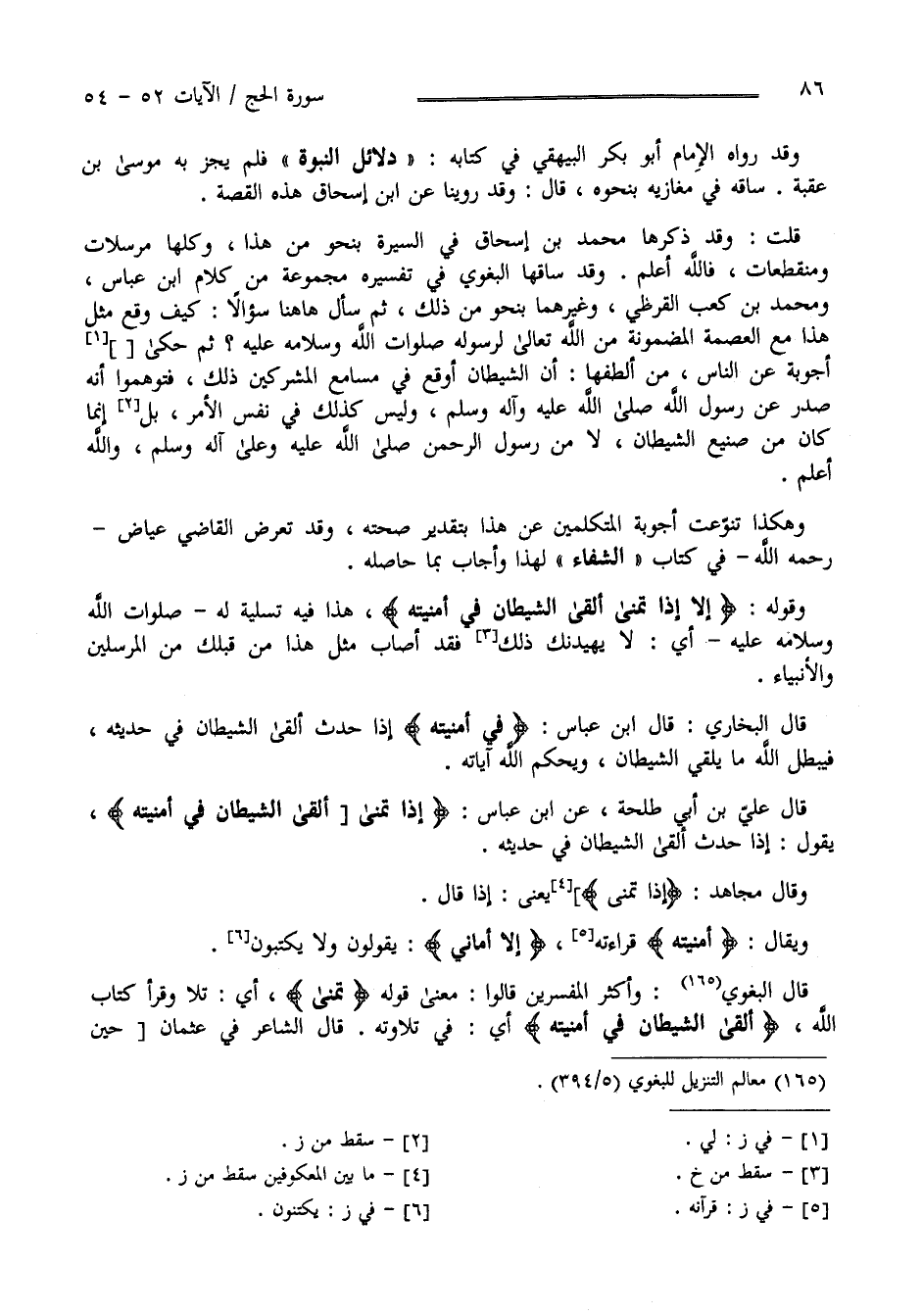 وَقَدْ رَوَاهُ الْحَافِظ أَبُو بَكْر الْبَيْهَقِيّ فِي كِتَابه دَلَائِل النُّبُوَّة فَلَمْ يَجُزْ بِهِ مُوسَى بْن عُقْبَة سَاقَهُ مِنْ مَغَازِيه بِنَحْوِهِ قَالَ وَقَدْ رَوَاهُ عَنْ أَبِي إِسْحَاق هَذِهِ الْقِصَّة " قُلْت " وَقَدْ ذَكَرَهَا مُحَمَّد بْن إِسْحَاق فِي السِّيرَة بِنَحْوٍ مِنْ هَذَا وَكُلّهَا مُرْسَلَات وَمُنْقَطِعَات وَاَللَّه أَعْلَم وَقَدْ سَاقَهَا الْبَغَوِيّ فِي تَفْسِيره مَجْمُوعَة مِنْ كَلَام اِبْن عَبَّاس وَمُحَمَّد بْن كَعْب الْقُرَظِيّ وَغَيْرهمَا بِنَحْوٍ مِنْ ذَلِكَ ثُمَّ سَأَلَ هَهُنَا سُؤَالًا كَيْف وَقَعَ مِثْل هَذَا مَعَ الْعِصْمَة الْمَضْمُونَة مِنْ اللَّه تَعَالَى لِرَسُولِهِ صَلَاة اللَّه وَسَلَامه عَلَيْهِ ثُمَّ حَكَى أَجْوِبَة عَنْ النَّاس مِنْ أَلْطَفهَا أَنَّ الشَّيْطَان أَوْقَع فِي مَسَامِع الْمُشْرِكِينَ ذَلِكَ فَتَوَهَّمُوا أَنَّهُ صَدَرَ عَنْ رَسُول اللَّه صَلَّى اللَّه عَلَيْهِ وَسَلَّمَ وَلَيْسَ كَذَلِكَ فِي نَفْس الْأَمْر بَلْ إِنَّمَا كَانَ مِنْ صَنِيع الشَّيْطَان لَا عَنْ رَسُول الرَّحْمَن وَاَللَّه أَعْلَم .