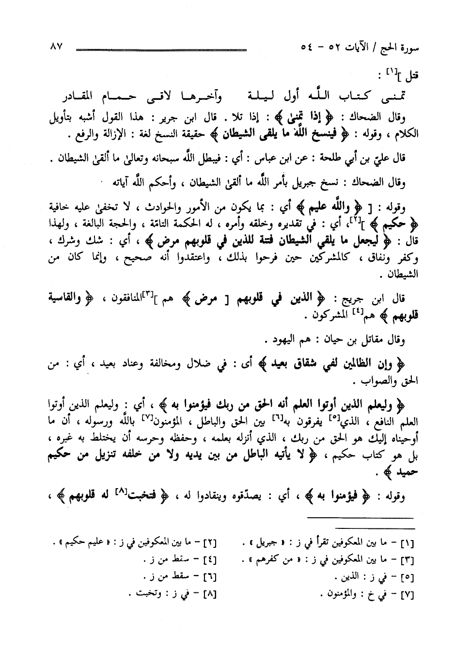 وَقَالَ الضَّحَّاك " إِذَا تَمَنَّى " إِذَا تَلَا قَالَ اِبْن جَرِير هَذَا الْقَوْل أَشْبَه بِتَأْوِيلِ الْكَلَام وَقَوْله " فَيَنْسَخ اللَّه مَا يُلْقِي الشَّيْطَان " حَقِيقَة النَّسْخ لُغَة : الْإِزَالَة وَالرَّفْع قَالَ عَلِيّ بْن أَبِي طَلْحَة عَنْ اِبْن عَبَّاس أَيْ فَيُبْطِل اللَّه سُبْحَانه وَتَعَالَى مَا أَلْقَى الشَّيْطَان وَقَالَ الضَّحَّاك نَسَخَ جِبْرِيل بِأَمْرِ اللَّه مَا أَلْقَى الشَّيْطَان وَأَحْكَمَ اللَّه آيَاته وَقَوْله " وَاَللَّه عَلِيم " أَيْ بِمَا يَكُون مِنْ الْأُمُور وَالْحَوَادِث لَا تَخْفَى عَلَيْهِ خَافِيَة " حَكِيم " أَيْ فِي تَقْدِيره وَخَلْقه وَأَمْره لَهُ الْحِكْمَة التَّامَّة وَالْحُجَّة الْبَالِغَة وَلِهَذَا قَالَ" لِيَجْعَل مَا يُلْقِي الشَّيْطَان فِتْنَة لِلَّذِينَ فِي قُلُوبهمْ مَرَض " أَيْ شَكّ وَشِرْك وَكُفْر وَنِفَاق كَالْمُشْرِكِينَ حِين فَرِحُوا بِذَلِكَ وَاعْتَقَدُوا أَنَّهُ صَحِيح مِنْ عِنْد اللَّه وَإِنَّمَا كَانَ مِنْ الشَّيْطَان قَالَ اِبْن جُرَيْج " الَّذِينَ فِي قُلُوبهمْ مَرَض " هُمْ الْمُنَافِقُونَ " وَالْقَاسِيَة قُلُوبهمْ " هُمْ الْمُشْرِكُونَ وَقَالَ مُقَاتِل بْن حَيَّان هُمْ الْيَهُود " وَإِنَّ الظَّالِمِينَ لَفِي شِقَاق بَعِيد " أَيْ فِي ضَلَال وَمُخَالَفَة وَعِنَاد بَعِيد أَيْ مِنْ الْحَقّ وَالصَّوَاب .