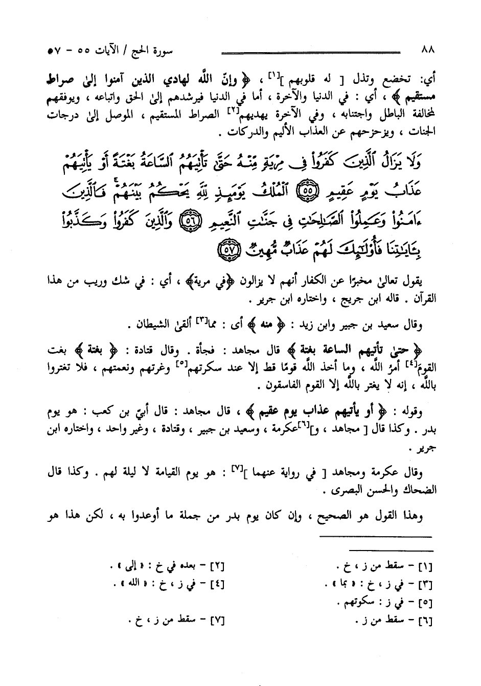 يَقُول تَعَالَى مُخْبِرًا عَنْ الْكُفَّار إِنَّهُمْ لَا يَزَالُونَ فِي مِرْيَة أَيْ فِي شَكّ مِنْ هَذَا الْقُرْآن قَالَهُ اِبْن جُرَيْج وَاخْتَارَهُ اِبْن جَرِير وَقَالَ سَعِيد بْن جُبَيْر وَابْن زَيْد " أَيْ مِمَّا أَلْقَى الشَّيْطَان " حَتَّى تَأْتِيَهُمْ السَّاعَة بَغْتَة " قَالَ مُجَاهِد فَجْأَة وَقَالَ قَتَادَة " بَغْتَة " بَغَتَ الْقَوْم أَمْر اللَّه وَمَا أَخَذَ اللَّه قَوْمًا قَطُّ إِلَّا عِنْد سَكْرَتهمْ وَغَرَّتهمْ وَنِعْمَتهمْ فَلَا تَغْتَرُّوا بِاَللَّهِ إِنَّهُ لَا يَغْتَرّ بِاَللَّهِ إِلَّا الْقَوْم الْفَاسِقُونَ وَقَوْله " أَوْ يَأْتِيَهُمْ عَذَاب يَوْم عَقِيم " قَالَ مُجَاهِد قَالَ أُبَيّ بْن كَعْب هُوَ يَوْم بَدْر وَكَذَا قَالَ مُجَاهِد وَعِكْرِمَة وَسَعِيد بْن جُبَيْر وَقَتَادَة وَغَيْر وَاحِد وَاخْتَارَهُ اِبْن جَرِير قَالَ عِكْرِمَة وَمُجَاهِد فِي رِوَايَة عَنْهُمَا هُوَ يَوْم الْقِيَامَة لَا لَيْل لَهُ وَكَذَا قَالَ الضَّحَّاك وَالْحَسَن الْبَصْرِيّ وَهَذَا الْقَوْل هُوَ الصَّحِيح وَإِنْ كَانَ يَوْم بَدْر مِنْ جُمْلَة مَا أُوعِدُوا بِهِ لَكِنَّ هَذَا هُوَ