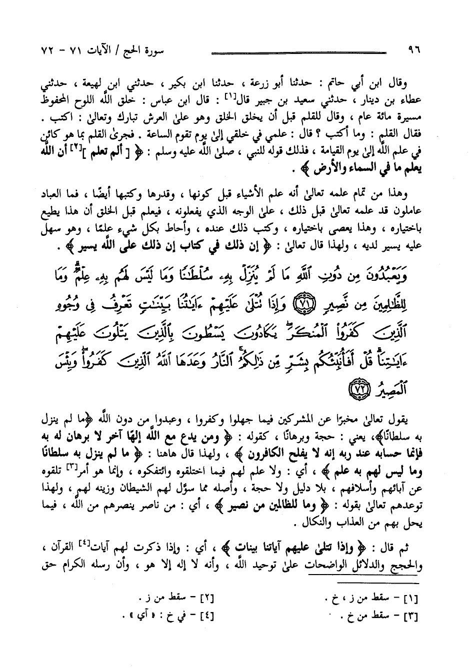 وَقَالَ اِبْن أَبِي حَاتِم حَدَّثَنَا أَبُو زُرْعَة حَدَّثَنَا اِبْن بُكَيْر حَدَّثَنِي عَطَاء بْن دِينَار حَدَّثَنِي سَعِيد بْن جُبَيْر قَالَ : قَالَ اِبْن عَبَّاس : " خَلَقَ اللَّه اللَّوْح الْمَحْفُوظ كَمَسِيرَةِ مِائَة عَام وَقَالَ لِلْقَلَمِ قَبْل أَنْ يَخْلُق الْخَلْق وَهُوَ عَلَى الْعَرْش - تَبَارَكَ وَتَعَالَى - اُكْتُبْ فَقَالَ الْقَلَم وَمَا أَكْتُب قَالَ عِلْمِي فِي خَلْقِي إِلَى يَوْم السَّاعَة فَجَرَى الْقَلَم بِمَا هُوَ كَائِن فِي عِلْم اللَّه إِلَى يَوْم الْقِيَامَة " فَذَلِكَ قَوْله لِلنَّبِيِّ صَلَّى اللَّه عَلَيْهِ وَسَلَّمَ : " أَلَمْ تَعْلَم أَنَّ اللَّه يَعْلَم مَا فِي السَّمَاء وَالْأَرْض " وَهَذَا مِنْ تَمَام عِلْمه تَعَالَى أَنَّهُ عَلِمَ الْأَشْيَاء قَبْل كَوْنهَا وَقَدَّرَهَا وَكَتَبَهَا أَيْضًا فَمَا الْعِبَاد عَامِلُونَ قَدْ عَلِمَهُ تَعَالَى قَبْل ذَلِكَ عَلَى الْوَجْه الَّذِي يَفْعَلُونَهُ فَيَعْلَم قَبْل الْخَلْق أَنَّ هَذَا يُطِيع بِاخْتِيَارِهِ وَهَذَا يَعْصِي بِاخْتِيَارِهِ وَكَتَبَ ذَلِكَ عِنْده وَأَحَاطَ بِكُلِّ شَيْء عِلْمًا وَهُوَ سَهْل عَلَيْهِ يَسِير لَدَيْهِ وَلِهَذَا قَالَ تَعَالَى " إِنَّ ذَلِكَ فِي كِتَاب إِنَّ ذَلِكَ عَلَى اللَّه يَسِير " .