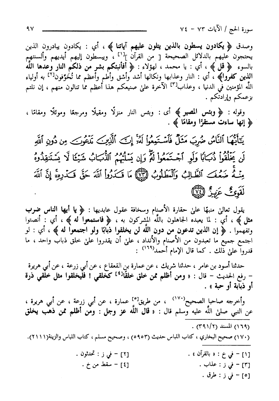 يَقُول تَعَالَى مُنَبِّهًا عَلَى حَقَارَة الْأَصْنَام وَسَخَافَة عُقُول عَابِدِيهَا " يَا أَيّهَا النَّاس ضُرِبَ مَثَل " أَيْ لِمَا يَعْبُدهُ الْجَاهِلُونَ بِاَللَّهِ الْمُشْرِكُونَ بِهِ " فَاسْتَمِعُوا لَهُ أَيْ أَنْصِتُوا وَتَفَهَّمُوا إِنَّ الَّذِينَ تَدْعُونَ مِنْ دُون اللَّه لَنْ يَخْلُقُوا ذُبَابًا وَلَوْ اِجْتَمَعُوا لَهُ " أَيْ لَوْ اِجْتَمَعَ جَمِيع مَا تَعْبُدُونَ مِنْ الْأَصْنَام وَالْأَنْدَاد عَلَى أَنْ يَقْدِرُوا عَلَى خَلْق ذُبَاب وَاحِد مَا قَدَرُوا عَلَى ذَلِكَ كَمَا قَالَ الْإِمَام أَحْمَد حَدَّثَنَا أَسْوَد بْن عَامِر حَدَّثَنَا شَرِيك عَنْ عُمَارَة بْن الْقَعْقَاع عَنْ أَبِي زُرْعَة عَنْ أَبِي هُرَيْرَة مَرْفُوعًا قَالَ " وَمَنْ أَظْلَم مِمَّنْ ذَهَبَ يَخْلُق كَخَلْقِي فَلْيَخْلُقُوا مِثْل خَلْقِي ذَرَّة أَوْ ذُبَابَة أَوْ حَبَّة " وَأَخْرَجَهُ صَاحِبَا الصَّحِيح مِنْ طَرِيق عُمَارَة عَنْ أَبِي زُرْعَة عَنْ أَبِي هُرَيْرَة عَنْ النَّبِيّ صَلَّى اللَّه عَلَيْهِ وَسَلَّمَ قَالَ : " قَالَ اللَّه عَزَّ وَجَلَّ وَمَنْ أَظْلَم مِمَّنْ ذَهَبَ يَخْلُق