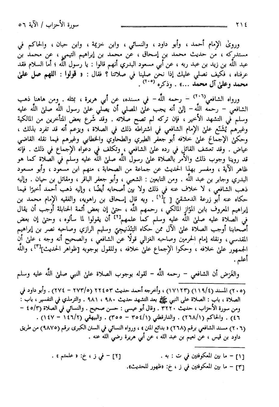 أَبُو جَعْفَر الطَّبَرِيّ وَالطَّحَاوِيّ وَالْخَطَّابِيّ وَغَيْرهمْ فِيمَا نَقَلَهُ الْقَاضِي عِيَاض عَنْهُمْ وَقَدْ تَعَسَّفَ هَذَا الْقَائِل فِي رَدّه عَلَى الشَّافِعِيّ وَتَكَلَّفَ فِي دَعْوَاهُ الْإِجْمَاع فِي ذَلِكَ وَقَالَ مَا لَمْ يُحِطْ بِهِ عِلْمًا فَإِنَّا قَدْ رُوِّينَا وُجُوب ذَلِكَ وَالْأَمْر بِالصَّلَاةِ عَلَى رَسُول اللَّه صَلَّى اللَّه عَلَيْهِ وَسَلَّمَ فِي الصَّلَاة كَمَا هُوَ ظَاهِر الْآيَة وَمُفَسَّر بِهَذَا الْحَدِيث عَنْ جَمَاعَة مِنْ الصَّحَابَة مِنْهُمْ اِبْن مَسْعُود وَأَبُو مَسْعُود الْبَدْرِيّ وَجَابِر بْن عَبْد اللَّه وَمِنْ التَّابِعِينَ الشَّعْبِيّ وَأَبُو جَعْفَر الْبَاقِر وَمُقَاتِل بْن حَيَّان وَإِلَيْهِ ذَهَبَ الشَّافِعِيّ لَا خِلَاف عَنْهُ فِي ذَلِكَ وَلَا بَيْن أَصْحَابه أَيْضًا وَإِلَيْهِ ذَهَبَ الْإِمَام أَحْمَد أَخِيرًا فِيمَا حَكَاهُ عَنْهُ اِبْن زُرْعَة الدِّمَشْقِيّ بِهِ وَبِهِ قَالَ إِسْحَاق بْن رَاهْوَيْهِ وَالْفَقِيه الْإِمَام مُحَمَّد بْن إِبْرَاهِيم الْمَعْرُوف بِابْنِ الْمَوَّاز الْمَالِكِيّ رَحِمَهمْ اللَّه تَعَالَى حَتَّى إِنَّ بَعْض أَئِمَّة الْحَنَابِلَة أَوْجَبَ أَنْ يُقَال فِي الصَّلَاة عَلَيْهِ صَلَّى اللَّه عَلَيْهِ وَسَلَّمَ كَمَا عَلَّمَهُمْ أَنْ يَقُولُوا لَمَّا سَأَلُوهُ وَحَتَّى أَنَّ بَعْض أَصْحَابنَا أَوْجَبَ الصَّلَاة عَلَى آلِهِ وَمِمَّنْ حَكَاهُ الْبَنْدَنِيجِيّ وَسُلَيْم الرَّازِيّ وَصَاحِبه نَصْر بْن إِبْرَاهِيم الْمَقْدِسِيّ وَنَقَلَهُ إِمَام الْحَرَمَيْنِ وَصَاحِبه الْغَزَالِيّ قَوْلًا عَنْ الشَّافِعِيّ وَالصَّحِيح أَنَّهُ وَجْه عَلَى أَنَّ الْجُمْهُور عَلَى خِلَافه وَحَكَوْا الْإِجْمَاع عَلَى خِلَافه وَلِلْقَوْلِ بِوُجُوبِهِ ظَوَاهِر الْحَدِيث وَاَللَّه أَعْلَم وَالْغَرَض أَنَّ الشَّافِعِيّ رَحِمَهُ اللَّه يَقُول بِوُجُوبِ الصَّلَاة عَلَى النَّبِيّ صَلَّى اللَّه عَلَيْهِ وَسَلَّمَ