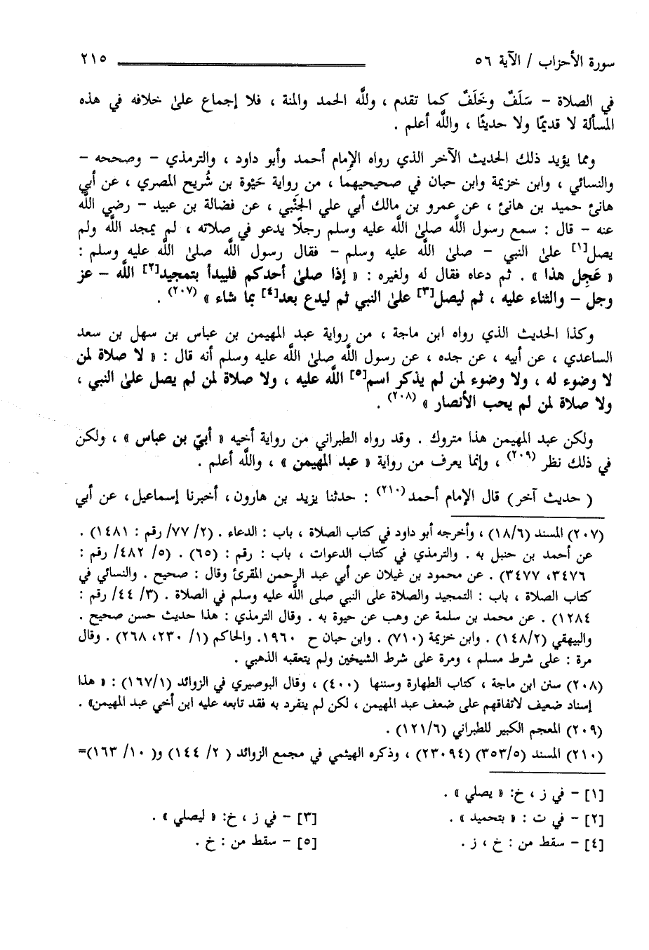 فِي الصَّلَاة سَلَفًا وَخَلَفًا كَمَا تَقَدَّمَ وَلِلَّهِ الْحَمْد وَالْمِنَّة فَلَا إِجْمَاع عَلَى خِلَافه فِي هَذِهِ الْمَسْأَلَة لَا قَدِيمًا وَلَا حَدِيثًا وَاَللَّه أَعْلَم وَمِمَّا يُؤَيِّد ذَلِكَ الْحَدِيث الْآخَر الَّذِي رَوَاهُ الْإِمَام أَحْمَد وَأَبُو دَاوُدَ وَالتِّرْمِذِيّ وَصَحَّحَهُ وَالنَّسَائِيّ وَابْن خُزَيْمَةَ وَابْن حِبَّان فِي صَحِيحَيْهِمَا مِنْ رِوَايَة حَيْوَةَ بْن شُرَيْح الْمِصْرِيّ عَنْ أَبِي هَانِئ حُمَيْد بْن هَانِئ عَنْ عَمْرو بْن مَالِك أَبِي عَلِيّ الْحُسَيْنِيّ عَنْ فَضَالَة بْن عُبَيْد رَضِيَ اللَّه عَنْهُ قَالَ سَمِعَ رَسُول اللَّه صَلَّى اللَّه عَلَيْهِ وَسَلَّمَ رَجُلًا يَدْعُو فِي صَلَاته لَمْ يُمَجِّد اللَّه وَلَمْ يُصَلِّ عَلَى النَّبِيّ فَقَالَ رَسُول اللَّه صَلَّى اللَّه عَلَيْهِ وَسَلَّمَ عَجِلَ هَذَا ثُمَّ دَعَاهُ فَقَالَ لَهُ أَوْ لِغَيْرِهِ إِذَا صَلَّى أَحَدكُمْ فَلْيَبْدَأْ بِتَمْجِيدِ اللَّه عَزَّ وَجَلَّ وَالثَّنَاء عَلَيْهِ ثُمَّ لِيُصَلِّ عَلَى النَّبِيّ ثُمَّ لِيَدْعُ بَعْد بِمَا شَاءَ وَكَذَا الْحَدِيث الَّذِي رَوَاهُ اِبْن مَاجَهْ مِنْ رِوَايَة عَبْد الْمُهَيْمِن بْن عَبَّاس بْن سَهْل بْن سَعْد السَّاعِدِيّ عَنْ أَبِيهِ عَنْ جَدّه عَنْ رَسُول اللَّه صَلَّى اللَّه عَلَيْهِ وَسَلَّمَ أَنَّهُ قَالَ لَا صَلَاة لِمَنْ لَا وُضُوء لَهُ وَلَا وُضُوء لِمَنْ لَمْ يَذْكُر اِسْم اللَّه عَلَيْهِ وَلَا صَلَاة لِمَنْ لَمْ يُصَلِّ عَلَى النَّبِيّ وَلَا صَلَاة
