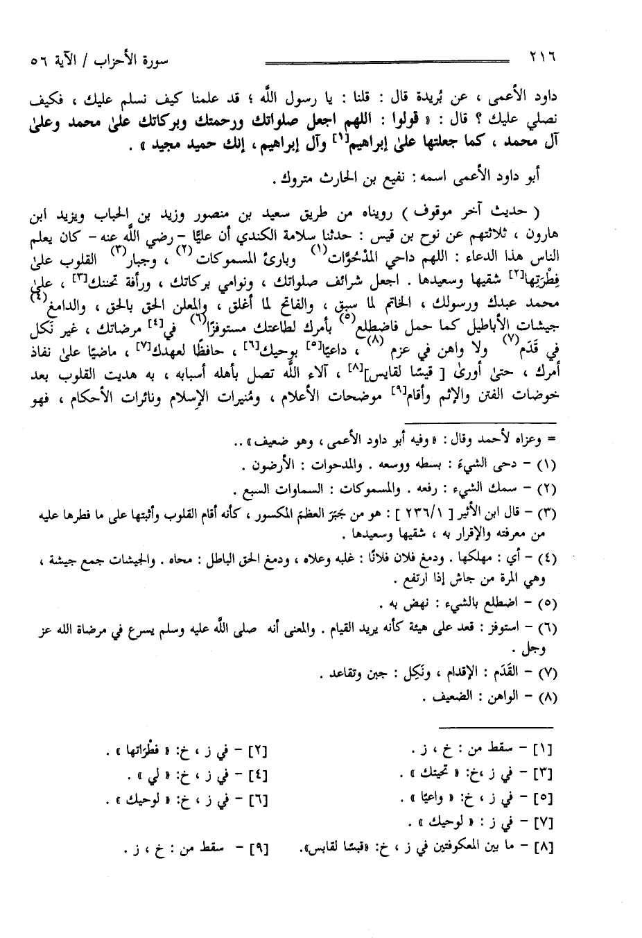 دَاوُدَ الْأَعْمَى عَنْ بُرَيْدَةَ قَالَ : قُلْنَا يَا رَسُول اللَّه قَدْ عَلِمْنَا كَيْف نُسَلِّم عَلَيْك فَكَيْف نُصَلِّي عَلَيْك ؟ قَالَ قُولُوا اللَّهُمَّ اِجْعَلْ صَلَوَاتك وَرَحْمَتك وَبَرَكَاتك عَلَى مُحَمَّد وَعَلَى آلِ مُحَمَّد كَمَا جَعَلْتهَا عَلَى إِبْرَاهِيم وَآلِ إِبْرَاهِيم إِنَّك حَمِيد مَجِيد أَبُو دَاوُدَ الْأَعْمَى اِسْمه نُفَيْع بْن الْحَارِث مَتْرُوك " .
