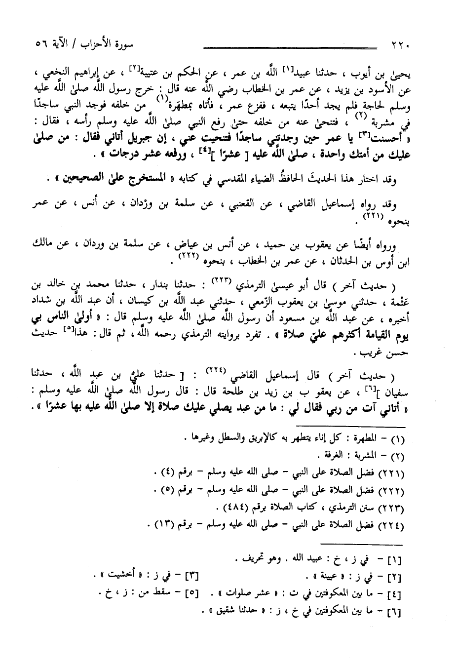 بْن كَيْسَان أَنَّ عَبْد اللَّه بْن شَدَّاد أَخْبَرَهُ عَنْ عَبْد اللَّه بْن مَسْعُود أَنَّ رَسُول اللَّه صَلَّى اللَّه عَلَيْهِ وَسَلَّمَ قَالَ أَوْلَى النَّاس بِي يَوْم الْقِيَامَة أَكْثَرهمْ عَلَيَّ صَلَاة تَفَرَّدَ بِرِوَايَتِهِ التِّرْمِذِيّ رَحِمَهُ اللَّه ثُمَّ قَالَ هَذَا حَدِيث حَسَن غَرِيب" حَدِيث آخَر " قَالَ إِسْمَاعِيل الْقَاضِي حَدَّثَنَا عَلِيّ بْن عَبْد اللَّه حَدَّثَنَا سُفْيَان عَنْ يَعْقُوب بْن زَيْد بْن طَلْحَة قَالَ : قَالَ رَسُول اللَّه صَلَّى اللَّه عَلَيْهِ وَسَلَّمَ أَتَانِي آتٍ مِنْ رَبِّي فَقَالَ لِي مَا مِنْ عَبْد يُصَلِّي عَلَيْك صَلَاة إِلَّا صَلَّى اللَّه عَلَيْهِ بِهَا عَشْرً