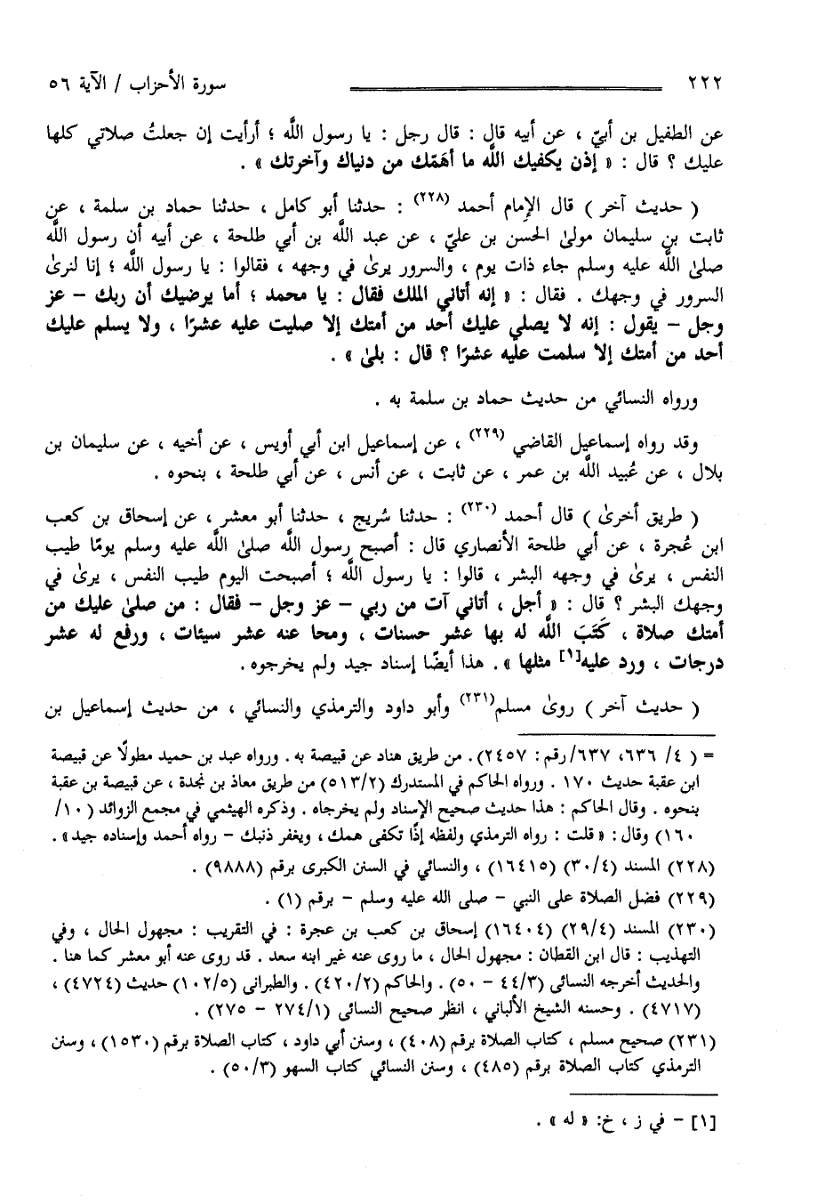بْن أَوْس بْن الْحَدَثَان عَنْ عُمَر بْن الْخَطَّاب بِنَحْوِهِ " حَدِيث آخَر " قَالَ الْإِمَام أَحْمَد حَدَّثَنَا أَبُو كَامِل حَدَّثَنَا حَمَّاد بْن سَلَمَة عَنْ ثَابِت بْن سُلَيْمَان مَوْلَى الْحَسَن بْن عَلِيّ عَنْ عَبْد اللَّه بْن أَبِي طَلْحَة عَنْ أَبِيهِ أَنَّ رَسُول اللَّه صَلَّى اللَّه عَلَيْهِ وَسَلَّمَ جَاءَ ذَات يَوْم وَالسُّرُور يُرَى فِي وَجْهه فَقَالُوا يَا رَسُول اللَّه إِنَّا لَنَرَى السُّرُور فِي وَجْهك فَقَالَ إِنَّهُ أَتَانِي الْمَلَك فَقَالَ يَا مُحَمَّد أَمَا يُرْضِيك أَنَّ رَبّك عَزَّ وَجَلَّ يَقُول إِنَّهُ لَا يُصَلِّي عَلَيْك أَحَد مِنْ أُمَّتك إِلَّا صَلَّيْت عَلَيْهِ عَشْرًا وَلَا يُسَلِّم عَلَيْك أَحَد مِنْ أُمَّتك إِلَّا سَلَّمْت عَلَيْهِ عَشْرًا ؟ قُلْت بَلَى وَرَوَاهُ النَّسَائِيّ مِنْ حَدِيث حَمَّاد بْن سَلَمَة بِهِ وَقَدْ رَوَاهُ إِسْمَاعِيل الْقَاضِي عَنْ إِسْمَاعِيل بْن أَبِي أُوَيْس عَنْ أَخِيهِ عَنْ سُلَيْمَان بْن بِلَال عَنْ عُبَيْد اللَّه بْن عُمَر عَنْ ثَابِت عَنْ أَنَس عَنْ أَبِي طَلْحَة بِنَحْوِهِ " طَرِيق أُخْرَى " قَالَ الْإِمَام أَحْمَد حَدَّثَنَا شُرَيْح حَدَّثَنَا أَبُو مَعْشَر عَنْ إِسْحَاق بْن كَعْب بْن عُجْرَة عَنْ أَبِي طَلْحَة الْأَنْصَارِيّ قَالَ أَصْبَحَ رَسُول اللَّه صَلَّى اللَّه عَلَيْهِ وَسَلَّمَ يَوْمًا طَيِّب النَّفْس يُرَى فِي وَجْهه الْبِشْر قَالُوا يَا رَسُول اللَّه أَصْبَحْت الْيَوْم طَيِّب النَّفْس يُرَى فِي وَجْهك الْبِشْر قَالَ أَجَلْ أَتَانِي آتٍ مِنْ رَبِّي عَزَّ وَجَلَّ فَقَالَ مَنْ صَلَّى عَلَيْك مِنْ أُمَّتك صَلَاة كَتَبَ اللَّه لَهُ بِهَا عَشْر حَسَنَات وَمَحَا عَنْهُ عَشْر سَيِّئَات وَرَفَعَ لَهُ عَشْر دَرَجَات وَرَدَّ عَلَيْهِ مِثْلهَا وَهَذَا أَيْضًا إِسْنَاد جَيِّد وَلَمْ يُخَرِّجُوهُ " حَدِيث آخَر " رَوَى مُسْلِم وَأَبُو دَاوُدَ وَالتِّرْمِذِيّ وَالنَّسَائِيّ مِنْ حَدِيث إِسْمَاعِيل بْن