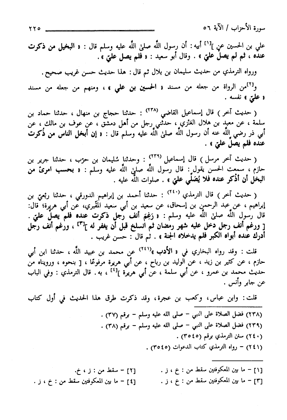 عَلِيّ بْن الْحُسَيْن عَنْ أَبِيهِ أَنَّ رَسُول اللَّه صَلَّى اللَّه عَلَيْهِ وَسَلَّمَ قَالَ : الْبَخِيل مَنْ ذُكِرْت عِنْده ثُمَّ لَمْ يُصَلِّ عَلَيَّ وَقَالَ أَبُو سَعِيد فَلَمْ يُصَلِّ عَلَيَّ وَرَوَاهُ التِّرْمِذِيّ مِنْ حَدِيث سُلَيْمَان بْن بِلَال ثُمَّ قَالَ هَذَا حَدِيث حَسَن غَرِيب صَحِيح وَمِنْ الرُّوَاة مَنْ جَعَلَهُ مِنْ سَنَد الْحُسَيْن بْن عَلِيّ وَمِنْهُمْ مَنْ جَعَلَهُ مِنْ مُسْنَد عَلِيّ نَفْسه " حَدِيث آخَر " قَالَ إِسْمَاعِيل الْقَاضِي حَدَّثَنَا حَجَّاج بْن مِنْهَال حَدَّثَنَا حَمَّاد بْن سَلَمَة عَنْ مَعْبَد بْن بِلَال الْعَنَزِيّ حَدَّثَنَا رَجُل مِنْ أَهْل دِمَشْق عَنْ عَوْف بْن مَالِك عَنْ أَبِي ذَرّ رَضِيَ اللَّه عَنْهُ أَنَّ رَسُول اللَّه صَلَّى اللَّه عَلَيْهِ وَسَلَّمَ قَالَ إِنَّ أَبْخَل النَّاس مَنْ ذُكِرْت عِنْده فَلَمْ يُصَلِّ عَلَيَّ " حَدِيث آخَر " مُرْسَل قَالَ إِسْمَاعِيل وَحَدَّثَنَا سُلَيْمَان بْن حَرْب حَدَّثَنَا جَرِير بْن حَازِم سَمِعْت الْحَسَن يَقُول قَالَ رَسُول اللَّه صَلَّى اللَّه عَلَيْهِ وَسَلَّمَ بِحَسْب