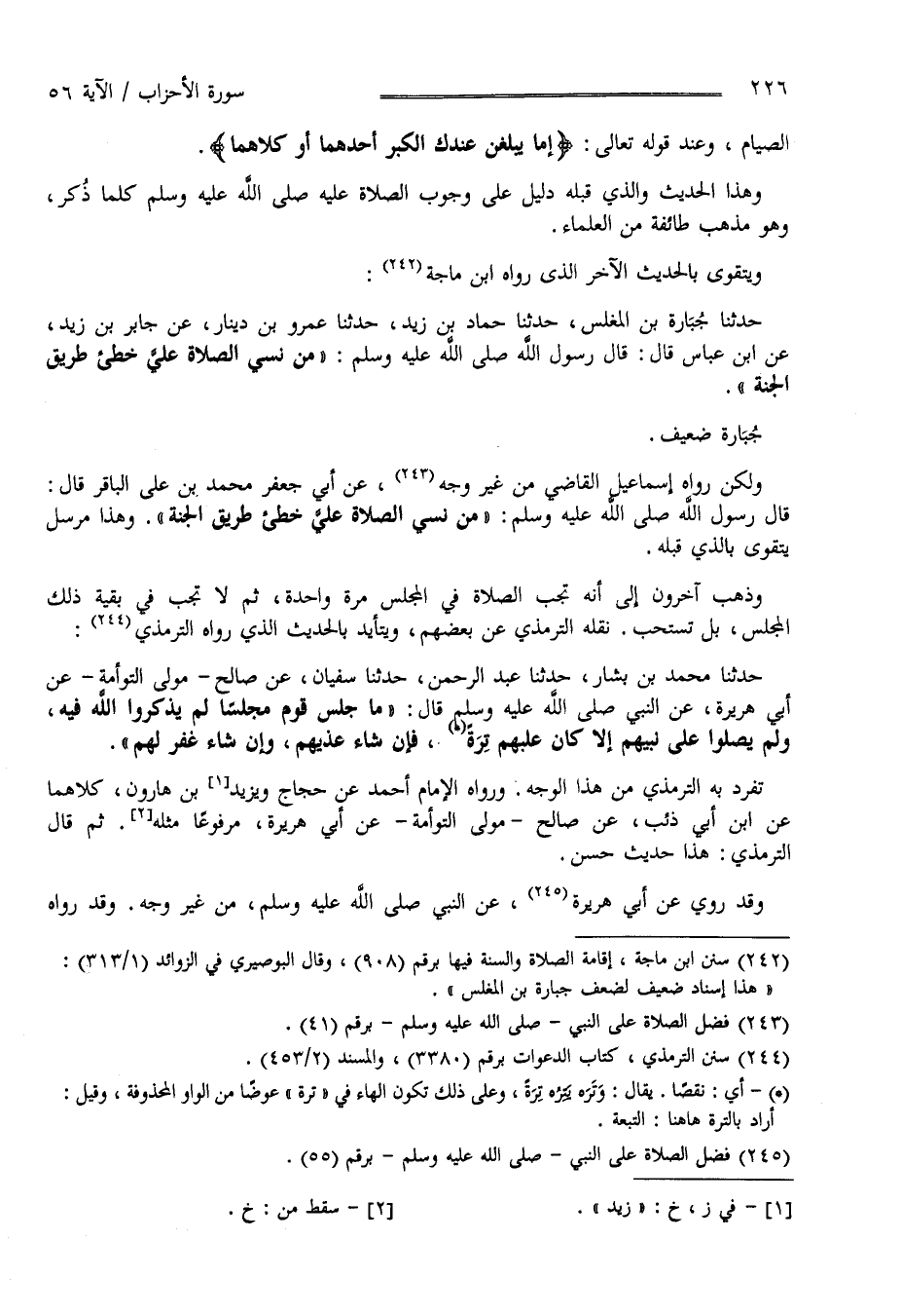 جُنَادَة ضَعِيف وَلَكِنْ رَوَاهُ إِسْمَاعِيل الْقَاضِي مِنْ غَيْر وَجْه عَنْ أَبِي جَعْفَر مُحَمَّد بْن عَلِيّ الْبَاقِر قَالَ : قَالَ رَسُول اللَّه صَلَّى اللَّه عَلَيْهِ وَسَلَّمَ مَنْ نَسِيَ الصَّلَاة عَلَيَّ أَخْطَأَ طَرِيق الْجَنَّة وَهَذَا مُرْسَل يَتَقَوَّى بِاَلَّذِي قَبْله وَاَللَّه أَعْلَم وَذَهَبَ آخَرُونَ إِلَى أَنَّهُ تَجِب الصَّلَاة عَلَيْهِ فِي الْمَجْلِس مَرَّة وَاحِدَة ثُمَّ لَا تَجِب فِي بَقِيَّة ذَلِكَ الْمَجْلِس بَلْ تُسْتَحَبّ نَقَلَهُ التِّرْمِذِيّ عَنْ بَعْضهمْ وَيَتَأَيَّد بِالْحَدِيثِ الَّذِي رَوَاهُ التِّرْمِذِيّ حَدَّثَنَا مُحَمَّد بْن بَشَّار حَدَّثَنَا عَبْد الرَّحْمَن حَدَّثَنَا سُفْيَان عَنْ صَالِح مَوْلَى التَّوْأَمَة عَنْ أَبِي هُرَيْرَة عَنْ النَّبِيّ صَلَّى اللَّه عَلَيْهِ وَسَلَّمَ قَالَ : مَا جَلَسَ قَوْم مَجْلِسًا لَمْ يَذْكُرُوا اللَّه فِيهِ وَلَمْ يُصَلُّوا عَلَى نَبِيّهمْ إِلَّا كَانَ عَلَيْهِمْ تِرَة يَوْم الْقِيَامَة فَإِنْ شَاءَ عَذَّبَهُمْ وَإِنْ شَاءَ غَفَرَ لَهُمْ تَفَرَّدَ بِهِ التِّرْمِذِيّ مِنْ هَذَا الْوَجْه وَرَوَاهُ الْإِمَام أَحْمَد عَنْ حَجَّاج وَيَزِيد بْن هَارُون كِلَاهُمَا عَنْ اِبْن أَبِي ذِئْب عَنْ صَالِح مَوْلَى التَّوْأَمَة عَنْ أَبِي هُرَيْرَة مَرْفُوعًا مِثْله ثُمَّ قَالَ التِّرْمِذِيّ هَذَا حَدِيث حَسَن وَقَدْ رُوِيَ عَنْ أَبِي هُرَيْرَة عَنْ النَّبِيّ صَلَّى اللَّه عَلَيْهِ وَسَلَّمَ مِنْ غَيْر وَجْه وَقَدْ رَوَاهُ