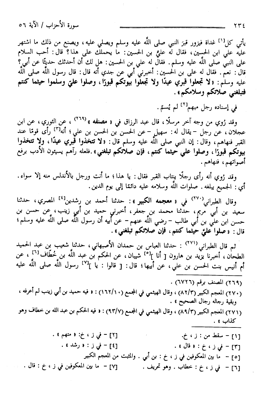 قَالَ لَا تَتَّخِذُوا قَبْرِي عِيدًا وَلَا تَتَّخِذُوا بُيُوتكُمْ قُبُورًا وَصَلُّوا عَلَيَّ حَيْثُمَا كُنْتُمْ فَإِنَّ صَلَاتكُمْ تَبْلُغنِي فَلَعَلَّهُ رَآهُمْ يُسِيئُونَ الْأَدَب بِرَفْعِ أَصْوَاتهمْ فَوْق الْحَاجَة فَنَهَاهُمْ وَقَدْ رُوِيَ أَنَّهُ رَأَى رَجُلًا يَنْتَاب الْقَبْر فَقَالَ : يَا هَذَا مَا أَنْتَ وَرَجُل بِالْأَنْدَلُسِ مِنْهُ إِلَّا سَوَاء أَيْ الْجَمِيع يَبْلُغهُ صَلَوَات اللَّه وَسَلَامه عَلَيْهِ دَائِمًا إِلَى يَوْم الدِّين وَقَالَ الطَّبَرَانِيّ فِي مُعْجَمه الْكَبِير حَدَّثَنَا أَحْمَد بْن رِشْدِين الْمِصْرِيّ حَدَّثَنَا سَعِيد بْن أَبِي مَرْيَم حَدَّثَنَا مُحَمَّد بْن جَعْفَر أَخْبَرَنِي حُمَيْد بْن أَبِي زَيْنَب عَنْ حَسَن بْن حَسَن بْن عَلِيّ بْن أَبِي طَالِب رَضِيَ اللَّه عَنْهُمْ عَنْ أَبِيهِ أَنَّ رَسُول اللَّه صَلَّى اللَّه عَلَيْهِ وَسَلَّمَ قَالَ صَلُّوا عَلَيَّ حَيْثُمَا كُنْتُمْ فَإِنَّ صَلَاتكُمْ تَبْلُغنِي ثُمَّ قَالَ الطَّبَرَانِيّ حَدَّثَنَا الْعَبَّاس بْن حَمْدَان الْأَصْبَهَانِيّ حَدَّثَنَا شُعَيْب بْن عَبْد الْحَمِيد الطَّحَّان أَخْبَرَنَا يَزِيد بْن هَارُون بْن أَبِي شَيْبَان عَنْ الْحَكَم بْن عَبْد اللَّه بْن الْخَطَّاب عَنْ أُمّ أُنَيْسٍ بِنْت الْحَسَن بْن عَلِيّ عَنْ أَبِيهَا قَالَ : قَالَ رَسُول اللَّه صَلَّى اللَّه عَلَيْهِ