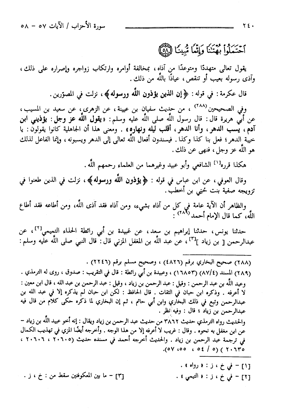 يَقُول تَعَالَى مُتَهَدِّدًا وَمُتَوَعِّدًا مَنْ أَذَاهُ بِمُخَالَفَةِ أَوَامِره وَارْتِكَاب زَوَاجِره وَإِصْرَاره عَلَى ذَلِكَ وَإِيذَاء رَسُوله بِعَيْبٍ أَوْ بِنَقْصٍ عِيَاذًا بِاَللَّهِ مِنْ ذَلِكَ - قَالَ عِكْرِمَة فِي قَوْله تَعَالَى " إِنَّ الَّذِينَ يُؤْذُونَ اللَّه وَرَسُوله " نَزَلَتْ فِي الْمُصَوِّرِينَ وَفِي الصَّحِيحَيْنِ مِنْ حَدِيث سُفْيَان بْن عُيَيْنَةَ عَنْ الزُّهْرِيّ عَنْ سَعِيد بْن الْمُسَيِّب عَنْ أَبِي هُرَيْرَة قَالَ : قَالَ رَسُول اللَّه صَلَّى اللَّه عَلَيْهِ وَسَلَّمَ يَقُول اللَّه عَزَّ وَجَلَّ : يُؤْذِينِي اِبْن آدَم يَسُبّ الدَّهْر وَأَنَا الدَّهْر أُقَلِّب لَيْله وَنَهَاره وَمَعْنَى هَذَا أَنَّ الْجَاهِلِيَّة كَانُوا يَقُولُونَ يَا خَيْبَة الدَّهْر فَعَلَ بِنَا كَذَا وَكَذَا فَيُسْنِدُونَ أَفْعَال اللَّه تَعَالَى إِلَى الدَّهْر وَيَسُبُّونَهُ وَإِنَّمَا الْفَاعِل لِذَلِكَ هُوَ اللَّه عَزَّ وَجَلَّ فَنَهَى عَنْ ذَلِكَ هَكَذَا قَرَّرَهُ الشَّافِعِيّ وَأَبُو عُبَيْدَة وَغَيْرهمَا مِنْ الْعُلَمَاء رَحِمَهمْ اللَّه وَقَالَ الْعَوْفِيّ عَنْ اِبْن عَبَّاس فِي قَوْله تَعَالَى " إِنَّ الَّذِينَ يُؤْذُونَ اللَّه وَرَسُوله " نَزَلَتْ فِي الَّذِينَ طَعَنُوا عَلَى النَّبِيّ صَلَّى اللَّه عَلَيْهِ وَسَلَّمَ فِي تَزْوِيجه صَفِيَّة بِنْت حُيَيّ بْن أَخْطَبَ وَالظَّاهِر أَنَّ الْآيَة عَامَّة فِي كُلّ مَنْ آذَاهُ بِشَيْءٍ وَمَنْ آذَاهُ فَقَدْ آذَى اللَّه كَمَا أَنَّ مَنْ أَطَاعَهُ فَقَدْ أَطَاعَ اللَّه كَمَا قَالَ الْإِمَام أَحْمَد حَدَّثَنَا يُونُس حَدَّثَنَا إِبْرَاهِيم بْن سَعْد عَنْ عُبَيْدَة بْن أَبِي رَائِطَة الْحَذَّاء الْمُجَاشِعِيّ عَنْ عَبْد الرَّحْمَن بْن زِيَاد عَنْ عَبْد الرَّحْمَن بْن الْمُغَفَّل الْمُزَنِيّ قَالَ : قَالَ رَسُول اللَّه صَلَّى اللَّه عَلَيْهِ وَسَلَّمَ
