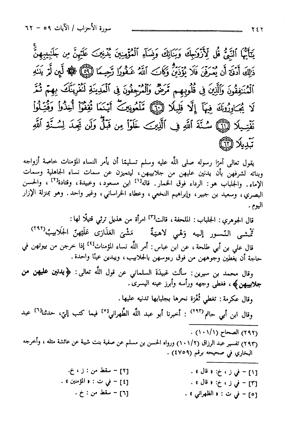 قَالَ عَلِيّ بْن أَبِي طَلْحَة عَنْ اِبْن عَبَّاس أَمَرَ اللَّه نِسَاء الْمُومِنِينَ إِذَا خَرَجْنَ مِنْ بُيُوتهنَّ فِي حَاجَة أَنْ يُغَطِّينَ وُجُوههنَّ مِنْ فَوْق رُءُوسهنَّ بِالْجَلَابِيبِ وَيُبْدِينَ عَيْنًا وَاحِدَة وَقَالَ مُحَمَّد بْن سِيرِينَ سَأَلْت عُبَيْدَة السَّلْمَانِيّ عَنْ قَوْل اللَّه عَزَّ وَجَلَّ " يُدْنِينَ عَلَيْهِنَّ مِنْ جَلَابِيبهنَّ" فَغَطَّى وَجْهه وَرَأْسه وَأَبْرَزَ عَيْنه الْيُسْرَى وَقَالَ عِكْرِمَة تُغَطِّي ثُغْرَة نَحْرهَا بِجِلْبَابِهَا تُدْنِيه عَلَيْهَا وَقَالَ اِبْن أَبِي حَاتِم حَدَّثَنَا أَبُو عَبْد اللَّه الطَّبَرَانِيّ فِيمَا كَتَبَ إِلَيَّ حَدَّثَنَا عَبْد
