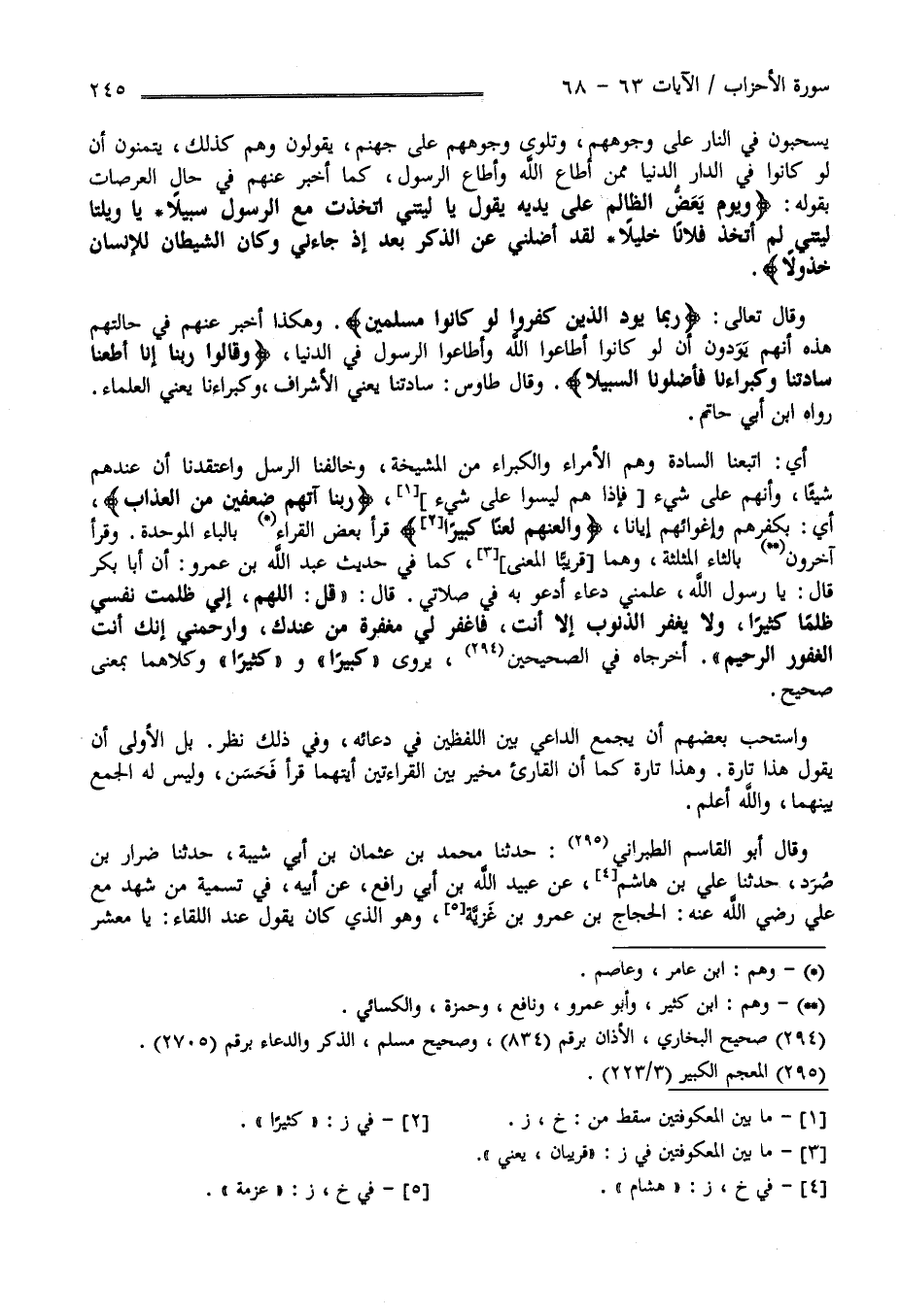 " رَبّنَا آتِهِمْ ضِعْفَيْنِ مِنْ الْعَذَاب " أَيْ بِكُفْرِهِمْ وَإِغْوَائِهِمْ إِيَّانَا " وَالْعَنْهُمْ لَعْنًا كَبِيرًا " قَرَأَ بَعْض الْقُرَّاء بِالْبَاءِ الْمُوَحَّدَة وَقَرَأَ آخَرُونَ بِالثَّاءِ الْمُثَلَّثَة وَهُمَا قَرِيبَا الْمَعْنَى كَمَا فِي حَدِيث عَبْد اللَّه بْن عَمْرو أَنَّ أَبَا بَكْر قَالَ يَا رَسُول اللَّه عَلِّمْنِي دُعَاء أَدْعُو بِهِ فِي صَلَاتِي قَالَ : " قُلْ اللَّهُمَّ إِنِّي ظَلَمْت نَفْسِي ظُلْمًا كَثِيرًا وَلَا يَغْفِر الذُّنُوب إِلَّا أَنْتَ فَاغْفِرْ لِي مَغْفِرَة مِنْ عِنْدك وَارْحَمْنِي إِنَّك أَنْتَ الْغَفُور الرَّحِيم أَخْرَجَاهُ فِي الصَّحِيحَيْنِ يُرْوَى كَثِيرًا وَكَبِيرًا وَكِلَاهُمَا بِمَعْنًى صَحِيح وَاسْتَحَبَّ بَعْضهمْ أَنْ يَجْمَع الدَّاعِي بَيْن اللَّفْظَيْنِ فِي دُعَائِهِ وَفِي ذَلِكَ نَظَر بَلْ الْأَوْلَى أَنْ يَقُول هَذَا تَارَة وَهَذَا تَارَة كَمَا أَنَّ الْقَارِئ مُخَيَّر بَيْن الْقِرَاءَتَيْنِ أَيَّتهمَا قَرَأَ أَحْسَن وَلَيْسَ لَهُ الْجَمْع بَيْنهمَا وَاَللَّه أَعْلَم وَقَالَ أَبُو الْقَاسِم الطَّبَرَانِيّ حَدَّثَنَا مُحَمَّد بْن عُثْمَان بْن أَبِي شَيْبَة حَدَّثَنَا ضِرَار بْن صُرَد حَدَّثَنَا عَلِيّ بْن هِشَام عَنْ عُبَيْد اللَّه بْن أَبِي رَافِع عَنْ أَبِيهِ فِي تَسْمِيَة مَنْ شَهِدَ مَعَ عَلِيّ رَضِيَ اللَّه عَنْهُ الْحَجَّاج بْن عَمْرو بْن غَزِيَّة وَهُوَ الَّذِي كَانَ يَقُول عِنْد اللِّقَاء يَا مَعْشَر