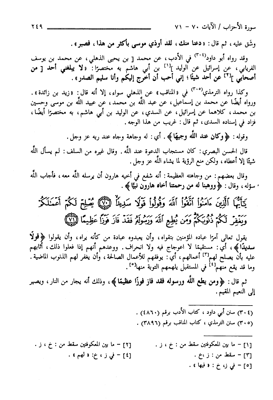 وَشَقَّ عَلَيْهِ ثُمَّ قَالَ دَعْنَا مِنْك لَقَدْ أُوذِيَ مُوسَى بِأَكْثَر مِنْ هَذَا فَصَبَرَ " وَقَدْ رَوَاهُ أَبُو دَاوُدَ فِي الْأَدَب عَنْ مُحَمَّد بْن يَحْيَى الذُّهْلِيّ عَنْ مُحَمَّد بْن يُوسُف الْفِرْيَابِيّ عَنْ إِسْرَائِيل عَنْ الْوَلِيد بْن أَبِي هِشَام بِهِ مُخْتَصَرًا " لَا يُبَلِّغنِي أَحَد عَنْ أَحَد شَيْئًا إِنِّي أُحِبّ أَنْ أَخْرُج إِلَيْكُمْ وَأَنَا سَلِيم الصَّدْر" وَكَذَا رَوَاهُ التِّرْمِذِيّ فِي الْمَنَاقِب عَنْ الذُّهْلِيّ سَوَاء إِلَّا أَنَّهُ قَالَ زَيْد بْن زَائِدَة وَرَوَاهُ أَيْضًا عَنْ مُحَمَّد بْن إِسْمَاعِيل عَنْ عَبْد اللَّه بْن مُحَمَّد عَنْ عُبَيْد اللَّه بْن مُوسَى وَحُسَيْن بْن مُحَمَّد كِلَاهُمَا عَنْ إِسْرَائِيل عَنْ السُّدِّيّ عَنْ الْوَلِيد بْن أَبِي هِشَام بِهِ مُخْتَصَرًا أَيْضًا فَزَادَ فِي إِسْنَاده السُّدِّيّ ثُمَّ قَالَ غَرِيب مِنْ هَذَا الْوَجْه وَقَوْله تَعَالَى : " وَكَانَ عِنْد اللَّه وَجِيهًا " أَيْ لَهُ وَجَاهَة وَجَاه عِنْد رَبّه عَزَّ وَجَلَّ قَالَ الْحَسَن الْبَصْرِيّ كَانَ مُسْتَجَاب الدَّعْوَة عِنْد اللَّه وَقَالَ غَيْره مِنْ السَّلَف لَمْ يَسْأَل اللَّه شَيْئًا إِلَّا أَعْطَاهُ وَلَكِنْ مُنِعَ الرُّؤْيَة لِمَا يَشَاء اللَّه عَزَّ وَجَلَّ وَقَالَ بَعْضهمْ مِنْ وَجَاهَته الْعَظِيمَة عِنْد اللَّه أَنَّهُ شَفَعَ فِي أَخِيهِ هَارُون أَنْ يُرْسِلهُ اللَّه مَعَهُ فَأَجَابَ اللَّه سُؤَاله فَقَالَ " وَوَهَبْنَا لَهُ مِنْ رَحْمَتنَا أَخَاهُ هَارُون نَبِيًّا " .