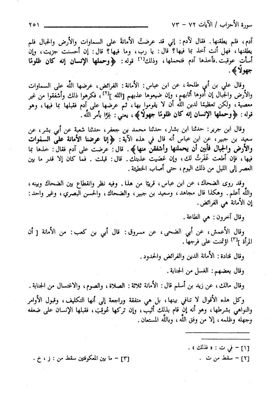 آدَم فَلَمْ يُطِقْنَهَا فَقَالَ لِآدَم : إِنِّي قَدْ عَرَضْت الْأَمَانَة عَلَى السَّمَاوَات وَالْأَرْض وَالْجِبَال فَلَمْ يُطِقْنَهَا فَهَلْ أَنْتَ آخِذ بِمَا فِيهَا ؟ قَالَ يَا رَبّ وَمَا فِيهَا ؟ قَالَ إِنْ أَحْسَنْت جُزِيت وَإِنْ أَسَأْت عُوقِبْت فَأَخَذَهَا آدَم فَتَحَمَّلَهَا فَذَلِكَ قَوْله تَعَالَى : " وَحَمَلَهَا الْإِنْسَان إِنَّهُ كَانَ ظَلُومًا جَهُولًا " وَقَالَ عَلِيّ بْن أَبِي طَلْحَة عَنْ اِبْن عَبَّاس : الْأَمَانَة الْفَرَائِض عَرَضَهَا اللَّه عَلَى السَّمَاوَات وَالْأَرْض وَالْجِبَال إِنْ أَدَّوْهَا أَثَابَهُمْ وَإِنْ ضَيَّعُوهَا عَذَّبَهُمْ فَكَرِهُوا ذَلِكَ وَأَشْفَقُوا عَلَيْهِ مِنْ غَيْر مَعْصِيَة وَلَكِنْ تَعْظِيمًا لِدِينِ اللَّه أَنْ لَا يَقُومُوا بِهَا ثُمَّ عَرَضَهَا عَلَى آدَم فَقَبِلَهَا بِمَا فِيهَا وَهُوَ قَوْله تَعَالَى : " وَحَمَلَهَا الْإِنْسَان إِنَّهُ كَانَ ظَلُومًا جَهُولًا " أَيْ غِرًّا بِأَمْرِ اللَّه وَقَالَ اِبْن جَرِير حَدَّثَنَا اِبْن بَشَّار حَدَّثَنَا مُحَمَّد بْن جَعْفَر حَدَّثَنَا شُعْبَة عَنْ أَبِي بِشْر عَنْ سَعِيد بْن جُبَيْر عَنْ اِبْن عَبَّاس أَنَّهُ قَالَ فِي هَذِهِ الْآيَة " إِنَّا عَرَضْنَا الْأَمَانَة عَلَى السَّمَاوَات وَالْأَرْض وَالْجِبَال فَأَبَيْنَ أَنْ يَحْمِلْنَهَا وَأَشْفَقْنَ مِنْهَا " قَالَ عُرِضَتْ عَلَى آدَم فَقَالَ خُذْهَا بِمَا فِيهَا فَإِنْ أَطَعْت غَفَرْت لَك وَإِنْ عَصَيْت عَذَّبْتُك قَالَ قَبِلْت فَمَا كَانَ إِلَّا مِقْدَار مَا بَيْن الْعَصْر إِلَى اللَّيْل مِنْ ذَلِكَ الْيَوْم حَتَّى أَصَابَ الْخَطِيئَة وَقَدْ رَوَى الضَّحَّاك عَنْ اِبْن عَبَّاس قَرِيبًا مِنْ هَذَا وَفِيهِ نَظَر وَانْقِطَاع بَيْن الضَّحَّاك وَبَيْنه وَاَللَّه أَعْلَم وَهَكَذَا قَالَ مُجَاهِد وَسَعِيد بْن جُبَيْر وَالضَّحَّاك وَالْحَسَن الْبَصْرِيّ وَغَيْر وَاحِد : إِنَّ الْأَمَانَة هِيَ الْفَرَائِض وَقَالَ آخَرُونَ هِيَ الطَّاعَة وَقَالَ أَعْمَش عَنْ أَبِي الضُّحَى عَنْ مَسْرُوق قَالَ : قَالَ أُبَيّ بْن كَعْب مِنْ الْأَمَانَة أَنَّ الْمَرْأَة اُؤْتُمِنَتْ عَلَى فَرْجهَا وَقَالَ قَتَادَة الْأَمَانَة الدِّين وَالْفَرَائِض وَالْحُدُود وَقَالَ بَعْضهمْ الْغُسْل مِنْ الْجَنَابَة وَقَالَ مَالِك عَنْ زَيْد بْن أَسْلَمَ قَالَ الْأَمَانَة ثَلَاثَة الصَّلَاة وَالصَّوْم وَالِاغْتِسَال مِنْ الْجَنَابَة وَكُلّ هَذِهِ الْأَقْوَال لَا تَنَافِي بَيْنهَا بَلْ هِيَ مُتَّفِقَة وَرَاجِعَة إِلَى أَنَّهَا التَّكْلِيف وَقَبُول الْأَوَامِر وَالنَّوَاهِي بِشَرْطِهَا وَهُوَ أَنَّهُ إِنْ قَامَ بِذَلِكَ أُثِيب وَإِنْ تَرَكَهَا عُوقِبَ فَقَبِلَهَا الْإِنْسَان عَلَى ضَعْفه وَجَهْله وَظُلْمه إِلَّا مَنْ وَفَّقَ اللَّه وَبِاَللَّهِ الْمُسْتَعَان