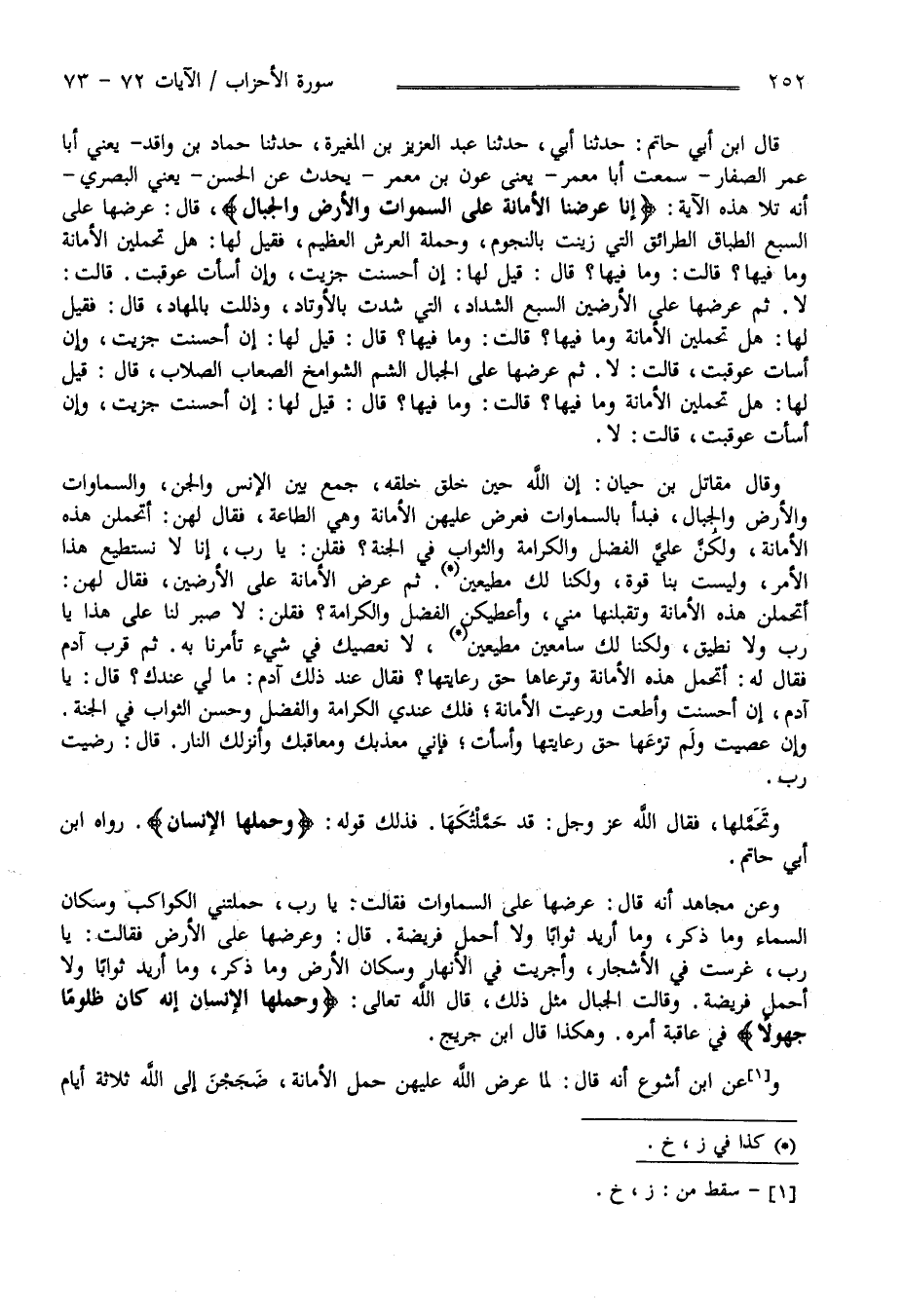 قَالَ اِبْن أَبِي حَاتِم حَدَّثَنَا أَبِي حَدَّثَنَا عَبْد الْعَزِيز بْن الْمُغِيرَة الْبَصْرِيّ حَدَّثَنَا حَمَّاد بْن وَاقِد يَعْنِي أَبَا عُمَر الصَّفَّار سَمِعْت أَبَا مَعْمَر يَعْنِي عَوْن بْن مَعْمَر يُحَدِّث عَنْ الْحَسَن يَعْنِي الْبَصْرِيّ أَنَّهُ تَلَا هَذِهِ الْآيَة " إِنَّا عَرَضْنَا الْأَمَانَة عَلَى السَّمَاوَات وَالْأَرْض وَالْجِبَال " قَالَ عَرَضَهَا عَلَى السَّبْع الطِّبَاق الطَّرَائِق الَّتِي زُيِّنَتْ بِالنُّجُومِ وَحَمَلَة الْعَرْش الْعَظِيم فَقِيلَ لَهَا هَلْ