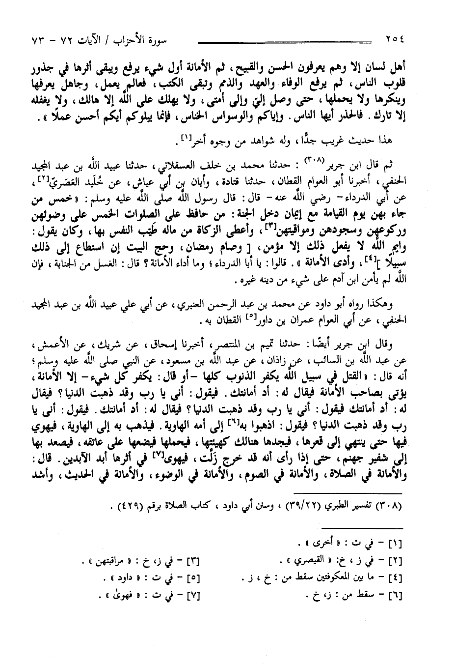 الصَّلَوَات الْخَمْس عَلَى وُضُوئِهِنَّ وَرُكُوعهنَّ وَسُجُودهنَّ وَمَوَاقِيتهنَّ وَأَعْطَى الزَّكَاة مِنْ مَاله طَيِّب النَّفْس بِهَا وَكَانَ يَقُول وَأَيْم اللَّه لَا يَفْعَل ذَلِكَ إِلَّا مُؤْمِن وَأَدَّى الْأَمَانَة " قَالُوا يَا أَبَا الدَّرْدَاء وَمَا أَدَاء الْأَمَانَة ؟ قَالَ رَضِيَ اللَّه عَنْهُ الْغُسْل مِنْ الْجَنَابَة فَإِنَّ اللَّه تَعَالَى لَمْ يَأْمَن اِبْن آدَم عَلَى شَيْء مِنْ دِينه غَيْره وَهَكَذَا رَوَاهُ أَبُو دَاوُدَ عَنْ مُحَمَّد بْن عَبْد الرَّحْمَن الْعَنْبَرِيّ عَنْ عُبَيْد اللَّه بْن عَبْد الْمَجِيد الْحَنَفِيّ عَنْ أَبِي الْعَوَّام عُمَر بْن دَاوُدَ الْقَطَّان بِهِ وَقَالَ اِبْن جَرِير أَيْضًا حَدَّثَنَا تَمِيم بْن الْمُنْتَصِر أَخْبَرَنَا إِسْحَاق عَنْ شَرِيك عَنْ الْأَعْمَش عَنْ عَبْد اللَّه بْن السَّائِب عَنْ زَاذَانَ عَنْ عَبْد اللَّه بْن مَسْعُود رَضِيَ اللَّه عَنْهُ عَنْ النَّبِيّ صَلَّى اللَّه عَلَيْهِ وَسَلَّمَ أَنَّهُ قَالَ : " الْقَتْل فِي سَبِيل اللَّه يُكَفِّر الذُّنُوب كُلّهَا أَوْ قَالَ يُكَفِّر كُلّ شَيْء إِلَّا الْأَمَانَة يُؤْتَى بِصَاحِبِ الْأَمَانَة فَيُقَال لَهُ أَدِّ أَمَانَتك فَيَقُول أَنَّى يَا رَبّ وَقَدْ ذَهَبَتْ الدُّنْيَا ؟ فَيُقَال لَهُ أَدِّ أَمَانَتك فَيَقُول أَنَّى يَا رَبّ وَقَدْ ذَهَبَتْ الدُّنْيَا ؟ فَيُقَال لَهُ أَدِّ أَمَانَتك فَيَقُول أَنَّى يَا رَبّ وَقَدْ ذَهَبَتْ الدُّنْيَا ؟ فَيَقُول اِذْهَبُوا بِهِ إِلَى أُمّه الْهَاوِيَة فَيُذْهَب بِهِ إِلَى الْهَاوِيَة فَيَهْوِي فِيهَا حَتَّى يَنْتَهِي إِلَى قَعْرهَا فَيَجِدهَا هُنَالِكَ كَهَيْئَتِهَا فَيَحْمِلهَا فَيَضَعهَا عَلَى عَاتِقه فَيَصْعَد بِهَا إِلَى شَفِير جَهَنَّم حَتَّى إِذَا رَأَى أَنَّهُ قَدْ خَرَجَ زَلَّتْ قَدَمُهُ فَهَوَى فِي أَثَرهَا أَبَد الْآبِدِينَ " قَالَ وَالْأَمَانَة فِي الصَّلَاة وَالْأَمَانَة فِي الصَّوْم وَالْأَمَانَة فِي الْوُضُوء وَالْأَمَانَة فِي الْحَدِيث وَأَشَدّ