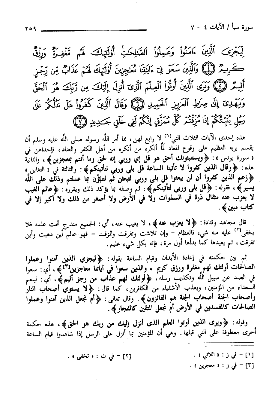 بِقَوْلِهِ تَعَالَى : " لِيَجْزِيَ الَّذِينَ آمَنُوا وَعَمِلُوا الصَّالِحَات أُولَئِكَ لَهُمْ مَغْفِرَة وَرِزْق كَرِيم وَاَلَّذِينَ سَعَوْا فِي آيَاتنَا مُعَاجِزِينَ " أَيْ سَعَوْا فِي الصَّدّ عَنْ سَبِيل اللَّه تَعَالَى وَتَكْذِيب رُسُله " أُولَئِكَ لَهُمْ عَذَاب مِنْ رِجْز أَلِيم " أَيْ لِيُنَعِّم السُّعَدَاء مِنْ الْمُؤْمِنِينَ وَيُعَذِّب الْأَشْقِيَاء مِنْ الْكَافِرِينَ كَمَا قَالَ عَزَّ وَجَلَّ : " لَا يَسْتَوِي أَصْحَاب النَّار وَأَصْحَاب الْجَنَّة أَصْحَاب الْجَنَّة هُمْ الْفَائِزُونَ " وَقَالَ تَعَالَى : " أَمْ نَجْعَل الَّذِينَ آمَنُوا وَعَمِلُوا الصَّالِحَات كَالْمُفْسِدِينَ فِي الْأَرْض أَمْ نَجْعَل الْمُتَّقِينَ كَالْفُجَّارِ " .