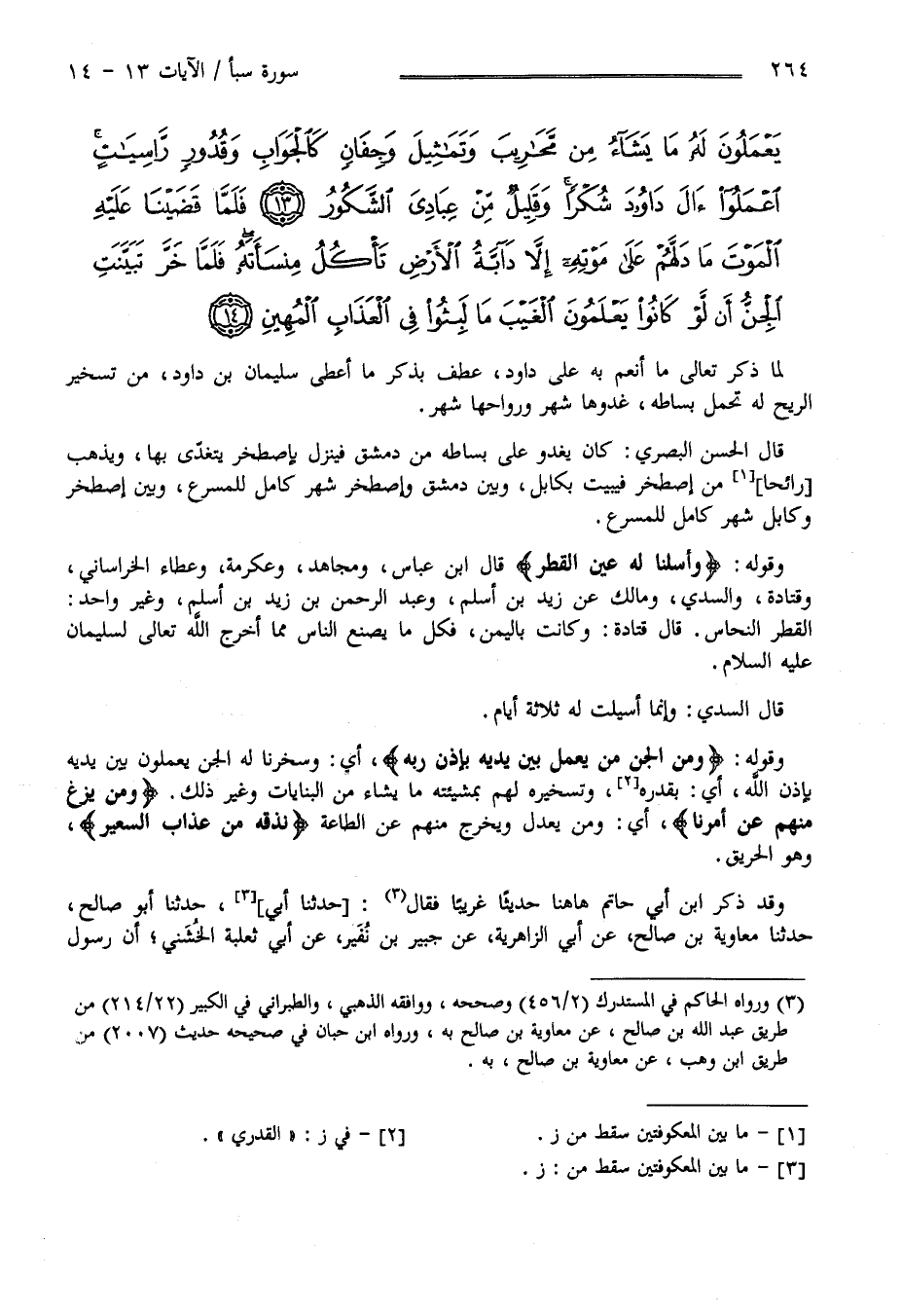 لَمَّا ذَكَرَ تَعَالَى مَا أَنْعَمَ بِهِ عَلَى دَاوُدَ عَطَفَ بِذِكْرِ مَا أَعْطَى اِبْنه سُلَيْمَان عَلَيْهِمَا السَّلَام مِنْ تَسْخِير الرِّيح لَهُ تَحْمِل بِسَاطه غُدُوُّهَا شَهْر وَرَوَاحهَا شَهْر قَالَ الْحَسَن الْبَصْرِيّ كَانَ يَغْدُو عَلَى بِسَاطه مِنْ دِمَشْق فَيَنْزِل بِإِصْطَخْرَ يَتَغَدَّى بِهَا وَيَذْهَب رَائِحًا مِنْ إِصْطَخْر فَيَبِيت بِكَابُل وَبَيْن دِمَشْق وَإِصْطَخْر شَهْر كَامِل لِلْمُسْرِعِ وَبَيْن إِصْطَخْر وَكَابُل شَهْر كَامِل لِلْمُسْرِعِ وَقَوْله تَعَالَى " وَأَسَلْنَا لَهُ عَيْن الْقِطْر " قَالَ اِبْن عَبَّاس رَضِيَ اللَّه عَنْهُمَا وَمُجَاهِد وَعِكْرِمَة وَعَطَاء الْخُرَاسَانِيّ وَقَتَادَة وَالسُّدِّيّ وَمَالِك عَنْ زَيْد بْن أَسْلَمَ وَعَبْد الرَّحْمَن بْن زَيْد بْن أَسْلَمَ وَغَيْر وَاحِد الْقِطْر النُّحَاس قَالَ قَتَادَة وَكَانَتْ بِالْيَمَنِ فَكُلّ مَا يَصْنَع النَّاس مِمَّا أَخْرَجَ اللَّه تَعَالَى لِسُلَيْمَان عَلَيْهِ السَّلَام قَالَ السُّدِّيّ وَإِنَّمَا أُسِيلَتْ لَهُ ثَلَاثَة أَيَّام وَقَوْله تَعَالَى : " وَمِنْ الْجِنّ مَنْ يَعْمَل بَيْن يَدَيْهِ بِإِذْنِ رَبّه " أَيْ وَسَخَّرْنَا لَهُ الْجِنّ يَعْمَلُونَ بَيْن يَدَيْهِ بِإِذْنِ رَبّه أَيْ بِقَدَرِهِ وَتَسْخِيره لَهُمْ بِمَشِيئَتِهِ مَا يَشَاء مِنْ الْبِنَايَات وَغَيْر ذَلِكَ " وَمَنْ يَزِغْ مِنْهُمْ عَنْ أَمْرنَا " أَيْ وَمَنْ يَعْدِل وَيَخْرُج مِنْهُمْ عَنْ الطَّاعَة" نُذِقْهُ مِنْ عَذَاب السَّعِير " وَهُوَ الْحَرِيق وَقَدْ ذَكَرَ اِبْن أَبِي حَاتِم هَهُنَا حَدِيثًا غَرِيبًا فَقَالَ حَدَّثَنَا أَبِي حَدَّثَنَا أَبُو صَالِح حَدَّثَنَا مُعَاوِيَة بْن صَالِح عَنْ أَبِي الزَّهْرَاء عَنْ جُبَيْر بْن نُفَيْر عَنْ أَبِي ثَعْلَبَة الْخُشَنِيّ رَضِيَ اللَّه عَنْهُ أَنَّ رَسُول