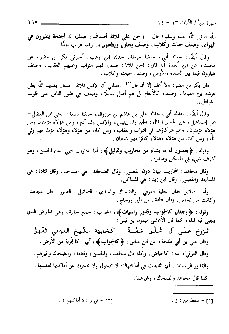 وَقَوْله تَعَالَى : " يَعْمَلُونَ لَهُ مَا يَشَاء مِنْ مَحَارِيب وَتَمَاثِيل " أَمَّا الْمَحَارِيب فَهِيَ الْبِنَاء الْحَسَن وَهُوَ أَشْرَف شَيْء فِي الْمَسْكَن وَصَدْره وَقَالَ مُجَاهِد الْمَحَارِيب بُنْيَان دُون الْقُصُور وَقَالَ الضَّحَّاك هِيَ الْمَسَاجِد وَقَالَ قَتَادَة هِيَ الْقُصُور وَالْمَسَاجِد وَقَالَ اِبْن زَيْد هِيَ الْمَسَاكِن وَأَمَّا التَّمَاثُل فَقَالَ عَطِيَّة الْعَوْفِيّ وَالضَّحَّاك وَالسُّدِّيّ التَّمَاثِيل الصُّوَر قَالَ مُجَاهِد وَكَانَتْ مِنْ نُحَاس وَقَالَ قَتَادَة مِنْ طِين وَزُجَاج وَقَوْله تَعَالَى : " وَجِفَان كَالْجَوَابِ وَقُدُور رَاسِيَات " الْجَوَاب جَمْع جَابِيَة وَهِيَ الْحَوْض الَّذِي يُجْبَى فِيهِ الْمَاء كَمَا قَالَ الْأَعْشَى مَيْمُون بْن قَيْس :