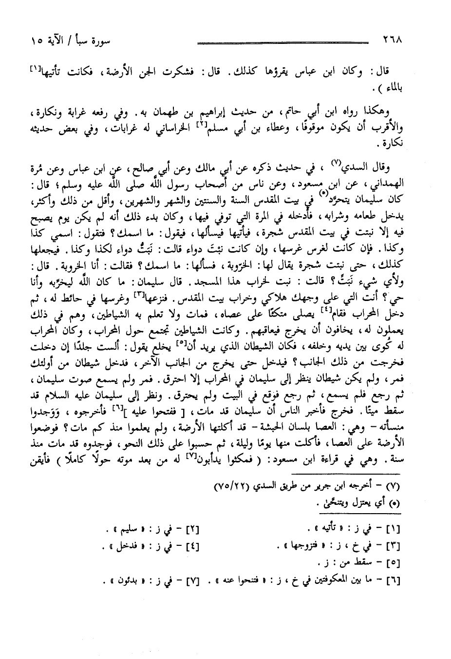 قَالَ وَكَانَ اِبْن عَبَّاس يَقْرَؤُهَا كَذَلِكَ قَالَ فَشَكَرْت الْجِنّ لِلْأَرَضَةِ فَكَانَتْ تَأْتِيهَا بِالْمَاءِ وَهَكَذَا رَوَاهُ اِبْن أَبِي حَاتِم مِنْ حَدِيث إِبْرَاهِيم بْن طَهْمَان بِهِ وَفِي رَفْعه غَرَابَة وَنَكَارَة وَالْأَقْرَب أَنْ يَكُون مَوْقُوفًا وَعَطَاء بْن أَبِي مُسْلِم الْخُرَاسَانِيّ لَهُ غَرَابَاتٌ وَفِي بَعْض حَدِيثه نَكَارَة وَقَالَ السُّدِّيّ فِي حَدِيث ذَكَرَهُ عَنْ أَبِي مَالِك عَنْ أَبِي صَالِح عَنْ اِبْن عَبَّاس رَضِيَ اللَّه عَنْهُمَا وَعَنْ مُرَّة الْهَمْدَانِيّ عَنْ اِبْن مَسْعُود رَضِيَ اللَّه عَنْهُ وَعَنْ نَاس مِنْ أَصْحَاب رَسُول اللَّه رَضِيَ اللَّه عَنْهُمْ قَالَ : كَانَ سُلَيْمَان عَلَيْهِ الصَّلَاة وَالسَّلَام يَتَحَرَّر فِي بَيْت الْمَقْدِس السَّنَة وَالسَّنَتَيْنِ وَالشَّهْر وَالشَّهْرَيْنِ وَأَقَلّ مِنْ ذَلِكَ وَأَكْثَر فَيَدْخُل فِيهِ وَمَعَهُ طَعَامه وَشَرَابه فَأَدْخَلَهُ فِي الْمَرَّة الَّتِي تُوُفِّيَ فِيهَا فَكَانَ بَدْء ذَلِكَ أَنَّهُ لَمْ يَكُنْ يَوْم يُصْبِح فِيهِ إِلَّا يُنْبِت اللَّه فِي بَيْت الْمَقْدِس شَجَرَة فَيَأْتِيهَا فَيَسْأَلهَا فَيَقُول مَا اِسْمك فَتَقُول الشَّجَرَة اِسْمِي كَذَا وَكَذَا فَإِنْ كَانَتْ لِغَرْسٍ غَرَسَهَا وَإِنْ كَانَتْ تَنْبُت دَوَاء قَالَتْ نَبَتّ دَوَاء كَذَا وَكَذَا فَيَجْعَلهَا كَذَلِكَ حَتَّى نَبَتَتْ شَجَرَة يُقَال