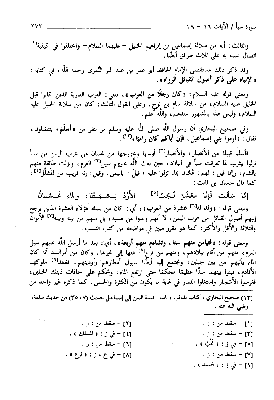 وَمَعْنَى قَوْله صَلَّى اللَّه عَلَيْهِ وَسَلَّمَ : وُلِدَ لَهُ عَشَرَة مِنْ الْعَرَب أَيْ كَانَ مِنْ نَسْله هَؤُلَاءِ الْعَشَرَة الَّذِينَ يَرْجِع إِلَيْهِمْ أُصُول الْقَبَائِل مِنْ عَرَب الْيَمَن لَا أَنَّهُمْ وُلِدُوا مِنْ صُلْبه بَلْ مِنْهُمْ مَنْ بَيْنه وَبَيْنه الْأَبَوَانِ وَالثَّلَاثَة وَالْأَقَلّ وَالْأَكْثَر كَمَا هُوَ مُقَرَّر مُبَيَّن فِي مَوَاضِعه مِنْ كُتُب النَّسَب وَمَعْنَى قَوْله صَلَّى اللَّه عَلَيْهِ وَسَلَّمَ : فَتَيَامَنَ مِنْهُمْ سِتَّة وَتَشَاءَمَ مِنْهُمْ أَرْبَعَة أَيْ بَعْدَمَا أَرْسَلَ اللَّه تَعَالَى عَلَيْهِمْ سَيْل الْعَرِم مِنْهُمْ مَنْ أَقَامَ بِبِلَادِهِمْ وَمِنْهُمْ مَنْ نَزَحَ عَنْهَا إِلَى غَيْرهَا.