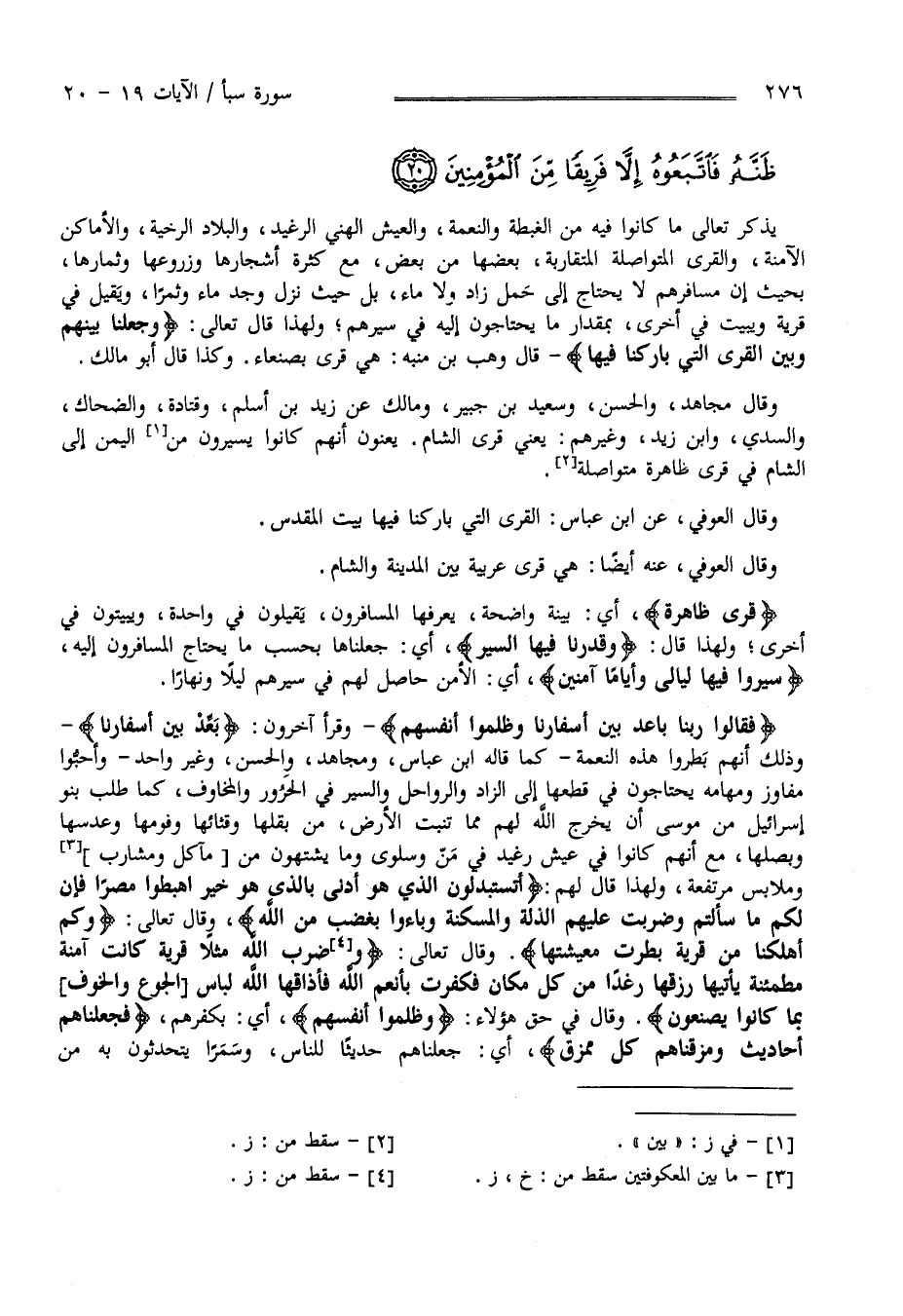 يَذْكُر تَعَالَى مَا كَانُوا فِيهِ مِنْ النِّعْمَة وَالْغِبْطَة وَالْعَيْش الْهَنِيء الرَّغِيد وَالْبِلَاد الْمَرْضِيَّة وَالْأَمَاكِن الْآمِنَة وَالْقُرَى الْمُتَوَاصِلَة الْمُتَقَارِبَة بَعْضهَا مِنْ بَعْض مَعَ كَثْرَة أَشْجَارهَا وَزُرُوعهَا وَثِمَارهَا بِحَيْثُ إِنَّ مُسَافِرهمْ لَا يَحْتَاج إِلَى حَمْل زَادَ وَلَا مَاء بَلْ حَيْثُ نَزَلَ وَجَدَ مَاء وَثَمَرًا وَيُقِيل فِي قَرْيَة وَيَبِيت فِي أُخْرَى بِمِقْدَارِ مَا يَحْتَاجُونَ إِلَيْهِ فِي سَيْرهمْ وَلِهَذَا قَالَ تَعَالَى " وَجَعَلْنَا بَيْنهمْ وَبَيْن الْقُرَى الَّتِي بَارَكْنَا فِيهَا " قَالَ وَهْب بْن مُنَبِّه هِيَ قُرًى بِصَنْعَاء وَكَذَا قَالَ أَبُو مَالِك وَقَالَ مُجَاهِد وَالْحَسَن وَسَعِيد بْن جُبَيْر وَمَالِك عَنْ زَيْد بْن أَسْلَمَ وَقَتَادَة وَالضَّحَّاك وَالسُّدِّيّ وَابْن زَيْد وَغَيْرهمْ يَعْنِي قُرَى الشَّام يَعْنُونَ أَنَّهُمْ كَانُوا يَسِيرُونَ مِنْ الْيَمَن إِلَى الشَّام فِي قُرًى ظَاهِرَة مُتَوَاصِلَة وَقَالَ الْعَوْفِيّ عَنْ اِبْن عَبَّاس الْقُرَى الَّتِي بَارَكْنَا فِيهَا بَيْت الْمَقْدِس وَقَالَ الْعَوْفِيّ عَنْهُ أَيْضًا هِيَ قُرًى عَرَبِيَّة بَيْن الْمَدِينَة وَالشَّام " قُرًى ظَاهِرَة " أَيْ بَيِّنَة وَاضِحَة يَعْرِفهَا الْمُسَافِرُونَ يُقِيلُونَ فِي وَاحِدَة وَيَبِيتُونَ فِي أُخْرَى وَلِهَذَا قَالَ تَعَالَى : " وَقَدَّرْنَا فِيهَا السَّيْر" أَيْ جَعَلْنَاهَا بِحَسَبِ مَا يَحْتَاج الْمُسَافِرُونَ إِلَيْهِ" سِيرُوا فِيهَا لَيَالِيَ وَأَيَّامًا آمِنِينَ " أَيْ الْأَمْن حَاصِل لَهُمْ فِي سَيْرهمْ لَيْلًا وَنَهَارًا .