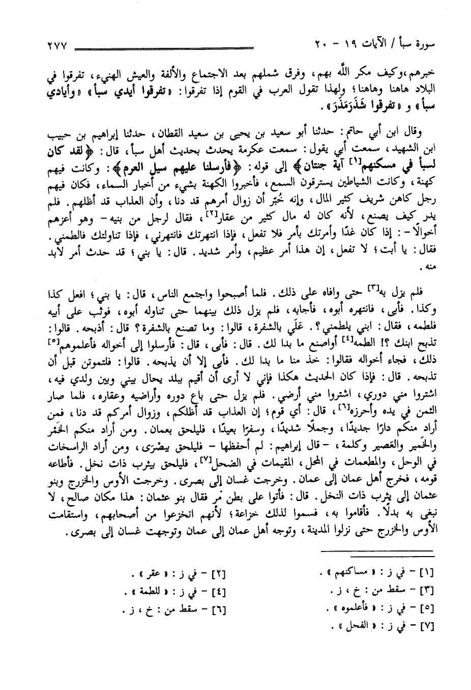 ْ خَبَرهمْ وَكَيْف مَكَرَ اللَّه بِهِمْ وَفَرَّقَ شَمْلهمْ بَعْد الِاجْتِمَاع وَالْأُلْفَة وَالْعَيْش الْهَنِيء تَفَرَّقُوا فِي الْبِلَاد هَهُنَا وَهَهُنَا وَلِهَذَا تَقُول الْعَرَب فِي الْقَوْم إِذَا تَفَرَّقُوا تَفَرَّقُوا أَيْدِي سَبَأ وَأَيَادِي سَبَأ وَتَفَرَّقُوا شَذَرَ مَذَرَ وَقَالَ اِبْن أَبِي حَاتِم حَدَّثَنَا أَبُو سَعِيد بْن يَحْيَى بْن سَعِيد الْقَطَّان حَدَّثَنَا إِبْرَاهِيم بْن حَبِيب بْن الشَّهِيد قَالَ سَمِعْت أَبِي يَقُول سَمِعْت عِكْرِمَة يُحَدِّث بِحَدِيثِ أَهْل سَبَأ قَالَ " لَقَدْ كَانَ لِسَبَأٍ فِي مَسْكَنهمْ آيَة جَنَّتَانِ عَنْ يَمِين وَشِمَال - إِلَى قَوْله تَعَالَى - فَأَرْسَلْنَا عَلَيْهِمْ سَيْل الْعَرِم " وَكَانَتْ فِيهِمْ كَهَنَة وَكَانَتْ الشَّيَاطِين يَسْتَرِقُونَ السَّمْع فَأَخْبَرُوا الْكَهَنَة بِشَيْءٍ مِنْ أَخْبَار السَّمَاء فَكَانَ فِيهِمْ رَجُل كَاهِن شَرِيف كَثِير الْمَال وَأَنَّهُ خَبَّرَ أَنَّ زَوَال أَمْرهمْ قَدْ دَنَا وَأَنَّ الْعَذَاب قَدْ أَظَلَّهُمْ فَلَمْ يَدْرِ كَيْف يَصْنَع لِأَنَّهُ كَانَ لَهُ مَال كَثِير مِنْ عَقَار فَقَالَ لِرَجُلٍ مِنْ بَنِيهِ وَهُوَ أَعَزّهمْ أَخْوَالًا يَا بُنَيّ إِذَا كَانَ غَدًا وَأَمَرْتُك بِأَمْرٍ فَلَا تَفْعَلهُ فَإِذَا اِنْتَهَرْتُك فَانْتَهِرْنِي فَإِذَا لَطَمْتُك فَالْطِمْنِي قَالَ يَا أَبَت لَا تَفْعَل إِنَّ هَذَا أَمْر عَظِيم وَأَمْر شَدِيد , قَالَ يَا بُنَيّ قَدْ حَدَث أَمْر لَا بُدّ مِنْهُ فَلَمْ يَزَلْ بِهِ حَتَّى وَافَاهُ عَلَى ذَلِكَ فَلَمَّا أَصْبَحُوا وَاجْتَمَعَ النَّاس قَالَ يَا بُنَيّ اِفْعَلْ كَذَا وَكَذَا فَأَبَى فَانْتَهَرَهُ أَبُوهُ فَأَجَابَهُ فَلَمْ يَزَلْ ذَلِكَ بَيْنهمَا حَتَّى تَنَاوَلَهُ أَبُوهُ فَلَطَمَهُ فَوَثَبَ عَلَى أَبِيهِ فَلَطَمَهُ فَقَالَ اِبْنِي
