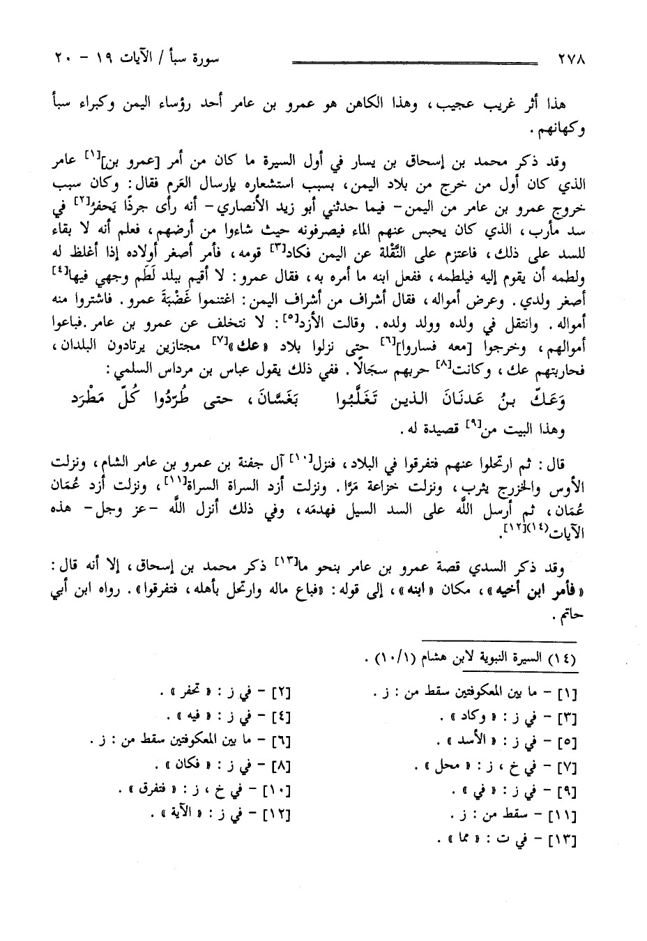 وَهَذَا الْبَيْت مِنْ قَصِيدَة لَهُ قَالَ ثُمَّ اِرْتَحَلُوا عَنْهُمْ فَتَفَرَّقُوا فِي الْبُلْدَان فَنَزَلَ آلُ جَفْنَة بْن عَمْرو بْن عَامِر الشَّام وَنَزَلَتْ الْأَوْس وَالْخَزْرَج يَثْرِب وَنَزَلَتْ خُزَاعَة مُرًّا وَنَزَلَتْ أَزْد السَّرَاة السَّرَاة وَنَزَلَتْ أَزْد عَمَّان عَمَّان ثُمَّ أَرْسَلَ اللَّه تَعَالَى عَلَى السَّدّ السَّيْل فَهَدَمَهُ وَفِي ذَلِكَ أَنْزَلَ اللَّه عَزَّ وَجَلَّ هَذِهِ الْآيَات وَقَدْ ذَكَرَ السُّدِّيّ قِصَّة عَمْرو بْن عَامِر بِنَحْو مِمَّا ذَكَرَ مُحَمَّد بْن إِسْحَاق إِلَّا أَنَّهُ قَالَ فَأَمَرَ اِبْن أَخِيهِ مَكَان اِبْنه - إِلَى قَوْله - فَبَاعَ مَالَهُ وَارْتَحَلَ بِأَهْلِهِ فَتَفَرَّقُوا رَوَاهُ اِبْن أَبِي حَاتِم