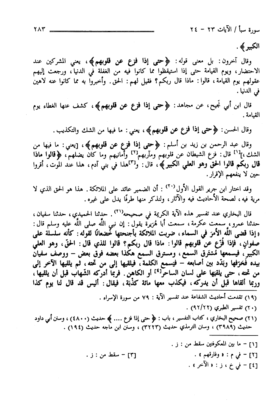 وَقَالَ الْحَسَن " حَتَّى إِذَا فُزِّعَ عَنْ قُلُوبهمْ " يَعْنِي مَا فِيهَا مِنْ الشَّكّ وَالتَّكْذِيب وَقَالَ عَبْد الرَّحْمَن بْن زَيْد بْن أَسْلَمَ " حَتَّى إِذَا فُزِّعَ عَنْ قُلُوبهمْ " يَعْنِي مَا فِيهَا مِنْ الشَّكّ قَالَ فَزَّعَ الشَّيْطَان عَنْ قُلُوبهمْ وَفَارَقَهُمْ وَأَمَانِيّهمْ وَمَا كَانَ يُضِلّهُمْ " قَالُوا مَاذَا قَالَ رَبّكُمْ قَالُوا الْحَقّ وَهُوَ الْعَلِيّ الْكَبِير " قَالَ وَهَذَا فِي بَنِي آدَم هَذَا عِنْد الْمَوْت أَقَرُّوا حِين لَا يَنْفَعهُمْ الْإِقْرَار وَقَدْ اِخْتَارَ اِبْن جَرِير الْقَوْل الْأَوَّل أَنَّ الضَّمِير عَائِد عَلَى الْمَلَائِكَة وَهَذَا هُوَ الْحَقّ الَّذِي لَا مِرْيَة فِيهِ لِصِحَّةِ الْأَحَادِيث فِيهِ وَالْآثَار وَلْنَذْكُرْ مِنْهَا طَرَفًا يَدُلّ عَلَى غَيْره .