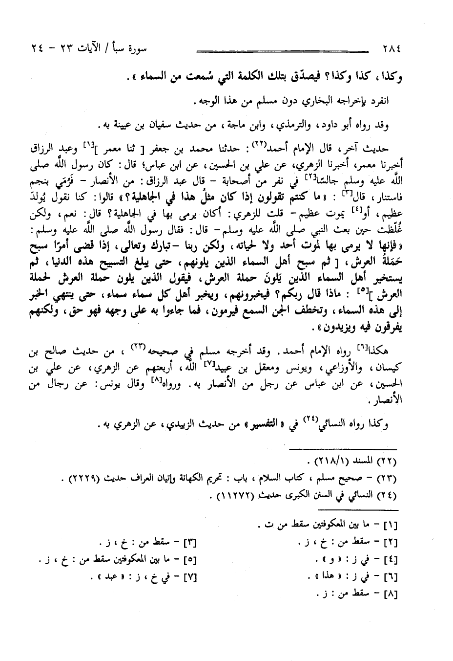 وَكَذَا كَذَا وَكَذَا ؟ فَيُصَدَّق بِتِلْكَ الْكَلِمَة الَّتِي سُمِعَتْ مِنْ السَّمَاء " اِنْفَرَدَ بِإِخْرَاجِهِ الْبُخَارِيّ دُون مُسْلِم مِنْ هَذَا الْوَجْه وَقَدْ رَوَاهُ اِبْن دَاوُدَ وَالتِّرْمِذِيّ وَابْن مَاجَهْ مِنْ حَدِيث سُفْيَان بْن عُيَيْنَةَ بِهِ وَاَللَّه أَعْلَم" حَدِيث آخَر " قَالَ الْإِمَام أَحْمَد حَدَّثَنَا مُحَمَّد بْن جَعْفَر وَعَبْد الرَّزَّاق قَالَا حَدَّثَنَا مَعْمَر أَخْبَرَنَا الزُّهْرِيّ عَنْ عَلِيّ بْن الْحُسَيْن عَنْ اِبْن عَبَّاس رَضِيَ اللَّه عَنْهُ مَا قَالَ : كَانَ رَسُول اللَّه صَلَّى اللَّه عَلَيْهِ وَسَلَّمَ جَالِسًا فِي نَفَر مِنْ أَصْحَابه قَالَ عَبْد الرَّزَّاق مِنْ الْأَنْصَار فَرُمِيَ بِنَجْمٍ فَاسْتَنَارَ فَقَالَ صَلَّى اللَّه عَلَيْهِ وَسَلَّمَ " مَا كُنْتُمْ تَقُولُونَ إِذَا كَانَ مِثْل هَذَا فِي الْجَاهِلِيَّة ؟ " قَالُوا كُنَّا نَقُول يُولَد عَظِيم أَوْ يَمُوت عَظِيم .
