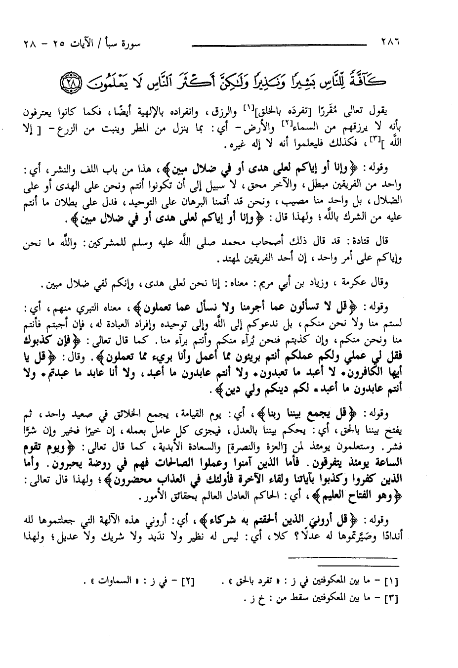 يَقُول تَعَالَى مُقَرِّرًا تَفَرُّده بِالْخَلْقِ وَالرِّزْق وَانْفِرَاده بِالْإِلَهِيَّةِ أَيْضًا فَكَمَا كَانُوا يَعْتَرِفُونَ بِأَنَّهُمْ لَا يَرْزُقهُمْ مِنْ السَّمَاء وَالْأَرْض أَيْ بِمَا يَنْزِل مِنْ الْمَطَر وَيَنْبُت مِنْ الزَّرْع إِلَّا اللَّه فَكَذَلِكَ فَلْيَعْلَمُوا أَنَّهُ لَا إِلَه غَيْره وَقَوْله تَعَالَى " وَإِنَّا أَوْ إِيَّاكُمْ لَعَلَى هُدًى أَوْ فِي ضَلَال مُبِين " هَذَا مِنْ بَاب اللَّفّ وَالنَّشْر أَيْ وَاحِد مِنْ الْفَرِيقَيْنِ مُبْطِل وَالْآخَر مُحِقّ لَا سَبِيل إِلَى أَنْ تَكُونُوا أَنْتُمْ وَنَحْنُ عَلَى الْهُدَى أَوْ عَلَى الضَّلَال بَلْ وَاحِد مِنَّا مُصِيب وَنَحْنُ قَدْ أَقَمْنَا الْبُرْهَان عَلَى التَّوْحِيد فَدَلَّ عَلَى بُطْلَان مَا أَنْتُمْ عَلَيْهِ مِنْ الشِّرْك بِاَللَّهِ تَعَالَى وَلِهَذَا قَالَ " وَإِنَّا أَوْ إِيَّاكُمْ لَعَلَى هُدًى أَوْ فِي ضَلَال مُبِين " .