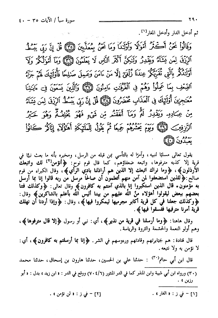 يَقُول تَعَالَى مُسَلِّيًا لِنَبِيِّهِ صَلَّى اللَّه عَلَيْهِ وَسَلَّمَ وَآمِرًا لَهُ بِالتَّأَسِّي بِمَنْ قَبْله مِنْ الرُّسُل وَمُخْبِره بِأَنَّهُ مَا بَعَثَ نَبِيًّا فِي قَرْيَة إِلَّا كَذَّبَهُ مُتْرَفُوهَا وَاتَّبَعَهُ ضُعَفَاؤُهُمْ كَمَا قَالَ قَوْم نُوح عَلَيْهِ الصَّلَاة وَالسَّلَام " أَنُؤْمِنُ لَك وَاتَّبَعَك الْأَرْذَلُونَ " " وَمَا نَرَاك اِتَّبَعَك إِلَّا الَّذِينَ هُمْ أَرَاذِلنَا بَادِيَ الرَّأْي " وَقَالَ الْكُبَرَاء مِنْ قَوْم صَالِح " لِلَّذِينَ اُسْتُضْعِفُوا لِمَنْ آمَنَ مِنْهُمْ أَتَعْلَمُونَ أَنَّ صَالِحًا مُرْسَل مِنْ رَبّه قَالُوا إِنَّا بِمَا أُرْسِلَ بِهِ مُؤْمِنُونَ قَالَ الَّذِينَ اِسْتَكْبَرُوا إِنَّا بِاَلَّذِي آمَنْتُمْ بِهِ كَافِرُونَ " وَقَالَ عَزَّ وَجَلَّ " وَكَذَلِكَ فَتَنَّا بَعْضهمْ بِبَعْضٍ لِيَقُولُوا أَهَؤُلَاءِ مَنّ اللَّه عَلَيْهِمْ مِنْ بَيْننَا أَلَيْسَ اللَّه بِأَعْلَم بِالشَّاكِرِينَ " وَقَالَ تَعَالَى : " وَكَذَلِكَ جَعَلْنَا فِي كُلّ قَرْيَة أَكَابِر مُجْرِمِيهَا لِيَمْكُرُوا فِيهَا " وَقَالَ جَلَّ وَعَلَا " وَإِذَا أَرَدْنَا أَنْ نُهْلِك قَرْيَة أَمَرْنَا مُتْرَفِيهَا فَفَسَقُوا فِيهَا فَحَقّ عَلَيْهَا الْقَوْل فَدَمَّرْنَاهَا تَدْمِيرًا " وَقَالَ جَلَّ وَعَلَا هَهُنَا " وَمَا أَرْسَلْنَا فِي قَرْيَة مِنْ نَذِير " أَيْ نَبِيّ أَوْ رَسُول " إِلَّا قَالَ مُتْرَفُوهَا " وَهُمْ أُولُوا النِّعْمَة وَالْحِشْمَة وَالثَّرْوَة وَالرِّيَاسَة قَالَ قَتَادَة هُمْ جَبَابِرَتهمْ وَقَادَتهمْ وَرُءُوسهمْ فِي الشَّرّ " إِنَّا بِمَا أُرْسِلْتُمْ بِهِ كَافِرُونَ " أَيْ لَا نُؤْمِن بِهِ وَلَا نَتَّبِعهُ .