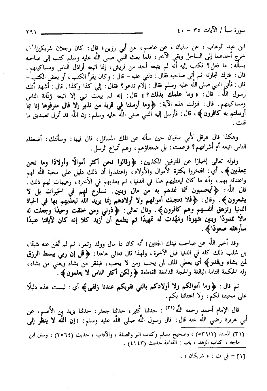 فَكَتَبَ إِلَيْهِ أَنَّهُ لَمْ يَتَّبِعهُ أَحَد مِنْ قُرَيْش إِنَّمَا اِتَّبَعَهُ أَرَاذِل النَّاس وَمَسَاكِينهمْ قَالَ فَتَرَكَ تِجَارَته ثُمَّ أَتَى صَاحِبه فَقَالَ دُلَّنِي عَلَيْهِ قَالَ وَكَانَ يَقْرَأ الْكُتُب أَوْ بَعْض الْكُتُب قَالَ فَأَتَى النَّبِيّ صَلَّى اللَّه عَلَيْهِ وَسَلَّمَ فَقَالَ إِلَامَ تَدْعُو ؟ قَالَ : " أَدْعُو إِلَى كَذَا وَكَذَا " قَالَ أَشْهَد أَنَّك رَسُول اللَّه قَالَ صَلَّى اللَّه عَلَيْهِ وَسَلَّمَ " وَمَا عِلْمك بِذَلِكَ ؟ " قَالَ إِنَّهُ لَمْ يُبْعَث نَبِيّ إِلَّا اِتَّبَعَهُ أَرَاذِل النَّاس وَمَسَاكِينهمْ قَالَ فَنَزَلَتْ هَذِهِ الْآيَة " وَمَا أَرْسَلْنَا فِي قَرْيَة مِنْ نَذِير إِلَّا قَالَ مُتْرَفُوهَا إِنَّا بِمَا أُرْسِلْتُمْ بِهِ كَافِرُونَ " الْآيَة قَالَ فَأَرْسَلَ إِلَيْهِ النَّبِيّ صَلَّى اللَّه عَلَيْهِ وَسَلَّمَ إِنَّ اللَّه عَزَّ وَجَلَّ قَدْ أَنْزَلَ تَصْدِيق مَا قُلْت وَهَكَذَا قَالَ هِرَقْل لِأَبِي سُفْيَان حِين سَأَلَهُ عَنْ تِلْكَ الْمَسَائِل قَالَ فِيهَا وَسَأَلْتُك أَضُعَفَاء النَّاس اِتَّبَعَهُ أَمْ أَشْرَافهمْ فَزَعَمْت بَلْ ضُعَفَاؤُهُمْ وَهُمْ أَتْبَاع الرُّسُل .