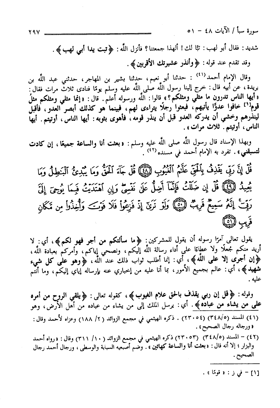 قَوْله عَزَّ وَجَلَّ " قُلْ إِنَّ رَبِّي يَقْذِف بِالْحَقِّ عَلَّام الْغُيُوب " كَقَوْلِهِ تَعَالَى : " يُلْقِي الرُّوح مِنْ أَمْره عَلَى مَنْ يَشَاء مِنْ عِبَاده " أَوْ يُرْسِل الْمَلَك إِلَى مَنْ يَشَاء مِنْ عِبَاده مِنْ أَهْل الْأَرْض وَهُوَ