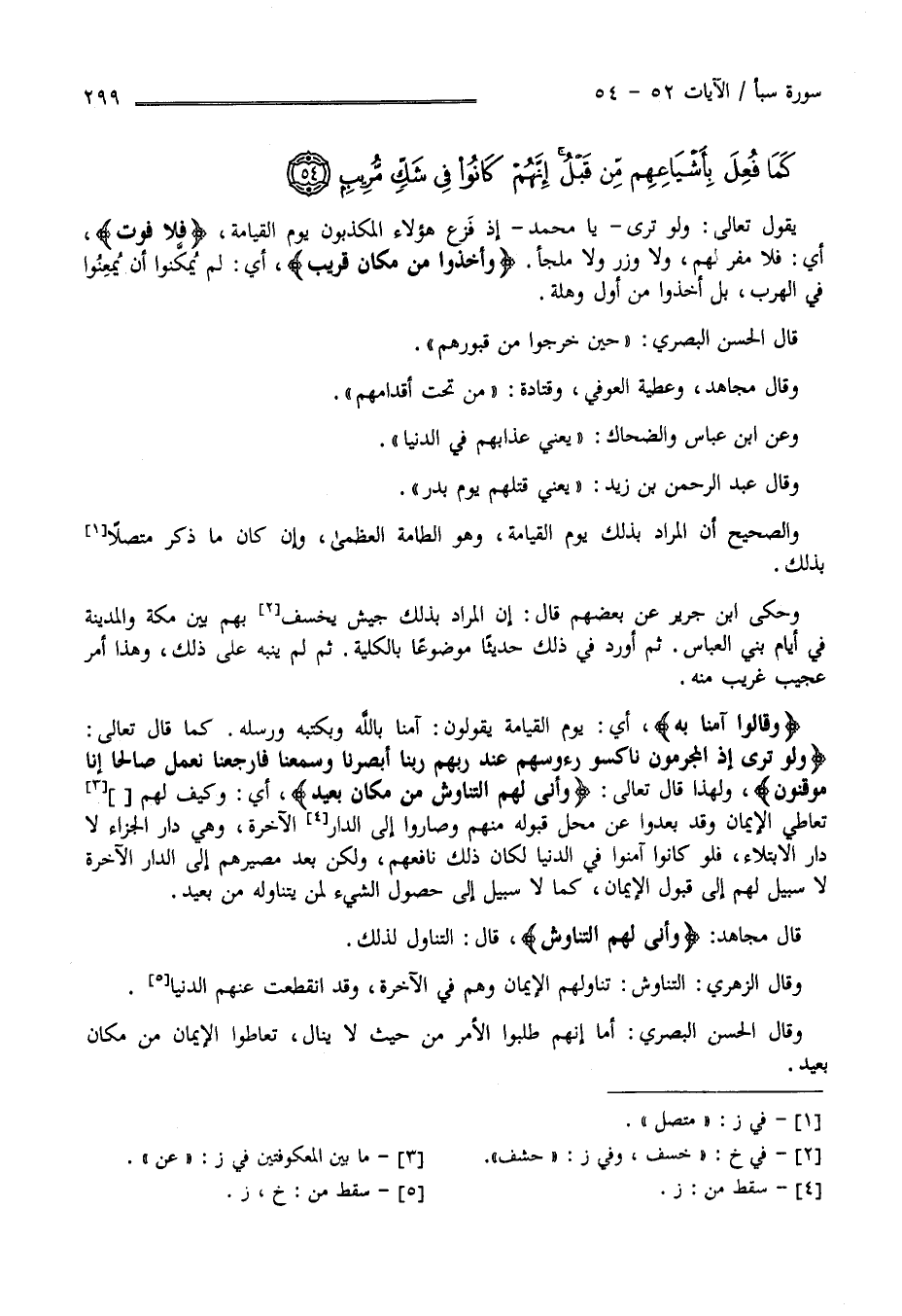 قَالَ مُجَاهِد " وَأَنَّى لَهُمْ التَّنَاوُش " قَالَ التَّنَاوُل لِذَلِكَ وَقَالَ الزُّهْرِيّ التَّنَاوُش تَنَاوُلهمْ الْإِيمَان وَهُمْ فِي الْآخِرَة وَقَدْ اِنْقَطَعَتْ عَنْهُمْ الدُّنْيَا وَقَالَ الْحَسَن الْبَصْرِيّ أَمَا إِنَّهُمْ طَلَبُوا الْأَمْر مِنْ حَيْثُ لَا يُنَال تَعَاطَوْا الْإِيمَان مِنْ مَكَانبَعِيد