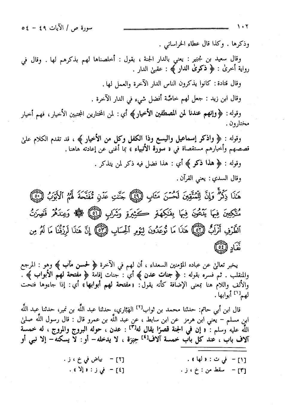 يُخْبِر تَعَالَى عَنْ عِبَاده الْمُؤْمِنِينَ السُّعَدَاء أَنَّ لَهُمْ فِي الدَّار الْآخِرَة لَحُسْنَ مَآبٍ وَهُوَ الْمَرْجِع وَالْمُنْقَلَب ثُمَّ فَسَّرَهُ بِقَوْلِهِ تَعَالَى " جَنَّات عَدْن " أَيْ جَنَّات إِقَامَة مُفَتَّحَة لَهُمْ الْأَبْوَاب وَالْأَلِف وَاللَّام هَهُنَا بِمَعْنَى الْإِضَافَة كَأَنَّهُ يَقُول مُفَتَّحَة لَهُمْ أَبْوَابهَا أَيْ إِذَا جَاءُوهَا فُتِحَتْ لَهُمْ أَبْوَابهَا قَالَ اِبْن أَبِي حَاتِم حَدَّثَنَا مُحَمَّد بْن ثَوَّاب الْهَبَّارِيّ حَدَّثَنَا عَبْد اللَّه بْن نُمَيْر حَدَّثَنَا عَبْد اللَّه بْن مُسْلِم يَعْنِي اِبْن هُرْمُز عَنْ اِبْن سَابِط عَنْ عَبْد اللَّه بْن عَمْرو رَضِيَ اللَّه عَنْهُمَا قَالَ : قَالَ رَسُول اللَّه صَلَّى اللَّه عَلَيْهِ وَسَلَّمَ " إِنَّ فِي الْجَنَّة قَصْرًا يُقَال لَهُ عَدْن حَوْله الْبُرُوج وَالْمُرُوج لَهُ خَمْسَة آلَاف بَاب عِنْد كُلّ بَاب خَمْسَة آلَاف حَبَرَة لَا يَدْخُلهُ - أَوْ لَا يَسْكُنهُ - إِلَّا نَبِيّ