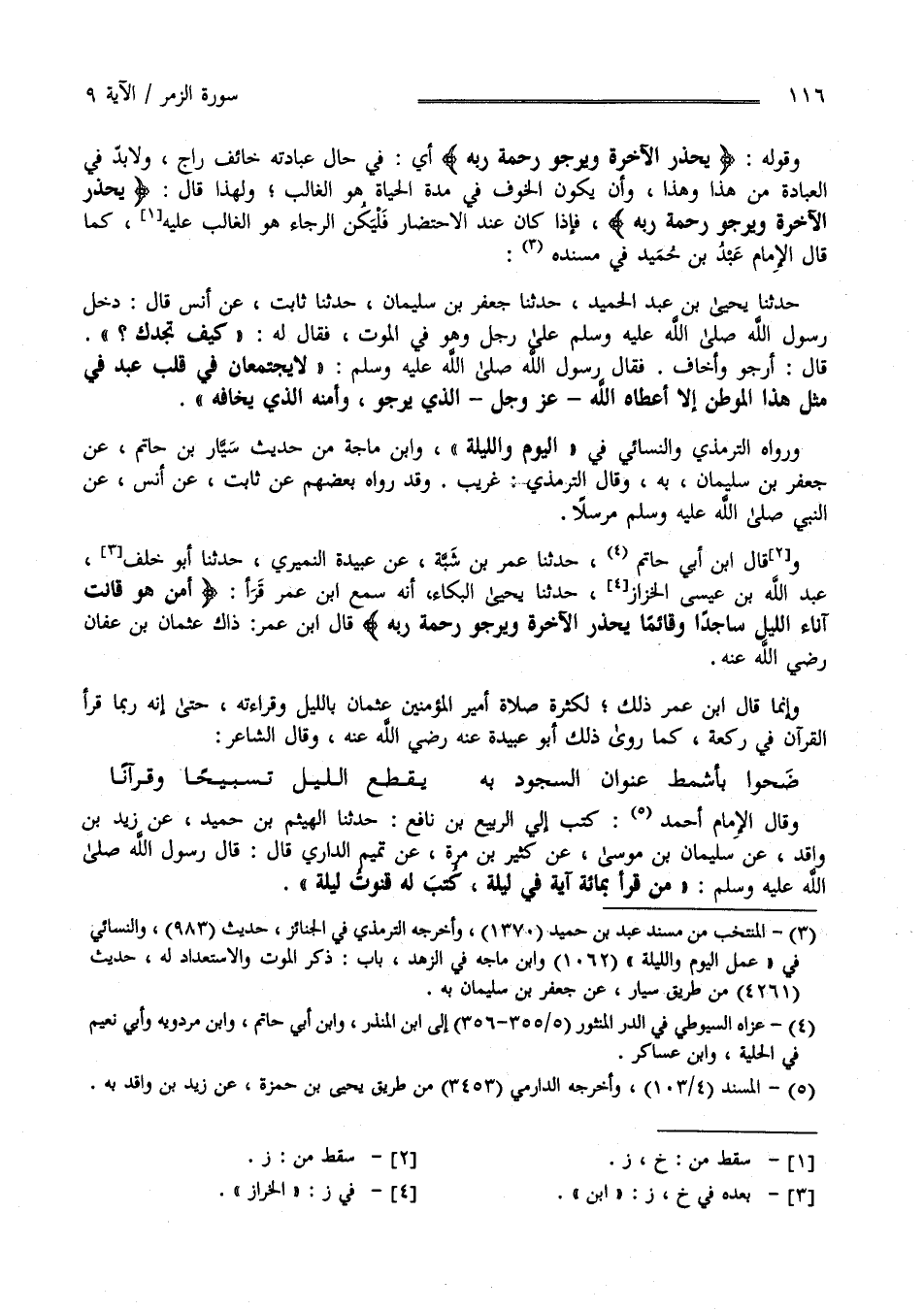 وَقَالَ اِبْن أَبِي حَاتِم حَدَّثَنَا عُمَر بْن أَبِي شَيْبَة عَنْ عُبَيْدَة النُّمَيْرِيّ حَدَّثَنَا أَبُو خَلَف بْن عَبْد اللَّه بْن عِيسَى الْخَرَّاز حَدَّثَنَا يَحْيَى الْبَكَّاء أَنَّهُ سَمِعَ اِبْن عُمَر رَضِيَ اللَّه عَنْهُمَا يَقْرَأ " أَمَّنْ هُوَ قَانِت آنَاء اللَّيْل سَاجِدًا وَقَائِمًا يَحْذَر الْآخِرَة وَيَرْجُو رَحْمَة رَبّه " قَالَ اِبْن عُمَر ذَاكَ عُثْمَان بْن عَفَّان رَضِيَ اللَّه عَنْهُ وَإِنَّمَا قَالَ اِبْن عُمَر رَضِيَ اللَّه عَنْهُمَا ذَلِكَ لِكَثْرَةِ صَلَاة أَمِير الْمُؤْمِنِينَ عُثْمَان رَضِيَ اللَّه عَنْهُ بِاللَّيْلِ وَقِرَاءَته حَتَّى إِنَّهُ رُبَّمَا قَرَأَ الْقُرْآن فِي رَكْعَة كَمَا رَوَى ذَلِكَ أَبُو عُبَيْدَة عَنْهُ رَضِيَ اللَّه تَعَالَى عَنْهُ وَقَالَ الشَّاعِر :