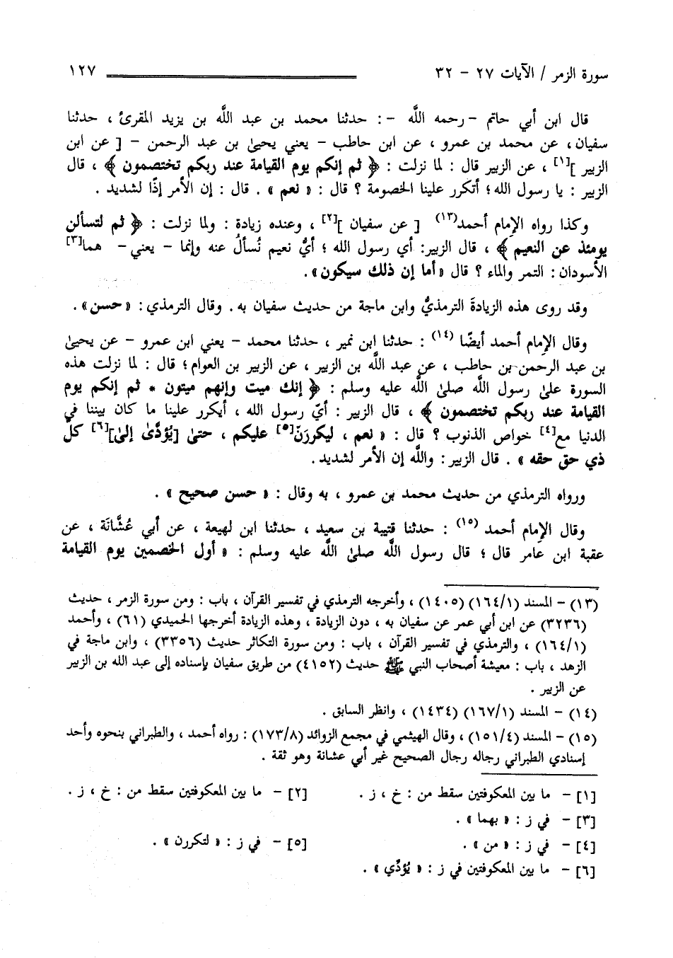قَالَ اِبْن أَبِي حَاتِم رَحِمَهُ اللَّه حَدَّثَنَا مُحَمَّد بْن عُبَيْد اللَّه بْن يَزِيد الْمُقْرِي حَدَّثَنَا سُفْيَان عَنْ مُحَمَّد بْن عَمْرو عَنْ أَبِي حَاطِب - يَعْنِي يَحْيَى بْن عَبْد الرَّحْمَن - عَنْ اِبْن الزُّبَيْر رَضِيَ اللَّه عَنْهُمَا قَالَ لَمَّا نَزَلَتْ " ثُمَّ إِنَّكُمْ يَوْم الْقِيَامَة عِنْد رَبّكُمْ تَخْتَصِمُونَ " قَالَ الزُّبَيْر رَضِيَ اللَّه عَنْهُ : يَا رَسُول اللَّه أَتُكَرَّرُ عَلَيْنَا الْخُصُومَة ؟ قَالَ صَلَّى اللَّه عَلَيْهِ وَسَلَّمَ " نَعَمْ " قَالَ رَضِيَ اللَّه عَنْهُ " إِنَّ الْأَمْر إِذًا لَشَدِيد .