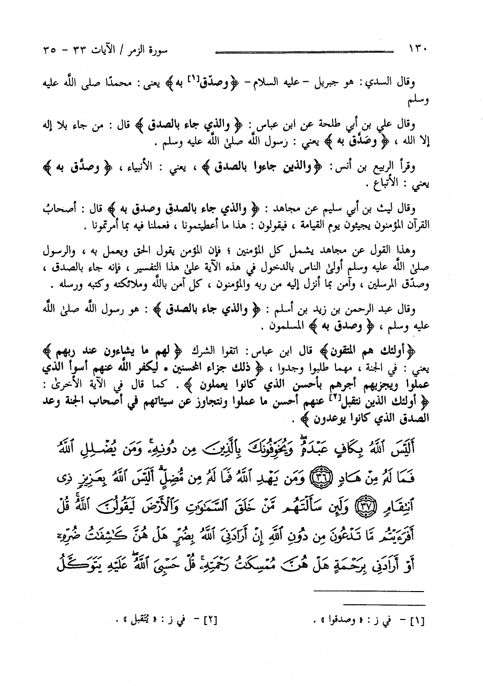 وَقَالَ السُّدِّيّ هُوَ جِبْرِيل عَلَيْهِ السَّلَام " وَصَدَّقَ بِهِ " يَعْنِي مُحَمَّدًا وَقَالَ عَلِيّ بْن أَبِي طَلْحَة عَنْ اِبْن عَبَّاس رَضِيَ اللَّه عَنْهُمَا " وَاَلَّذِي جَاءَ بِالصِّدْقِ " قَالَ مَنْ جَاءَ بِلَا إِلَه إِلَّا اللَّه " وَصَدَّقَ بِهِ " يَعْنِي رَسُول اللَّه صَلَّى اللَّه عَلَيْهِ وَسَلَّمَ وَقَرَأَ الرَّبِيع بْن أَنَس " الَّذِينَ جَاءُوا بِالصِّدْقِ " يَعْنِي الْأَنْبِيَاء " وَصَدَّقُوا بِهِ " يَعْنِي الْأَتْبَاع .