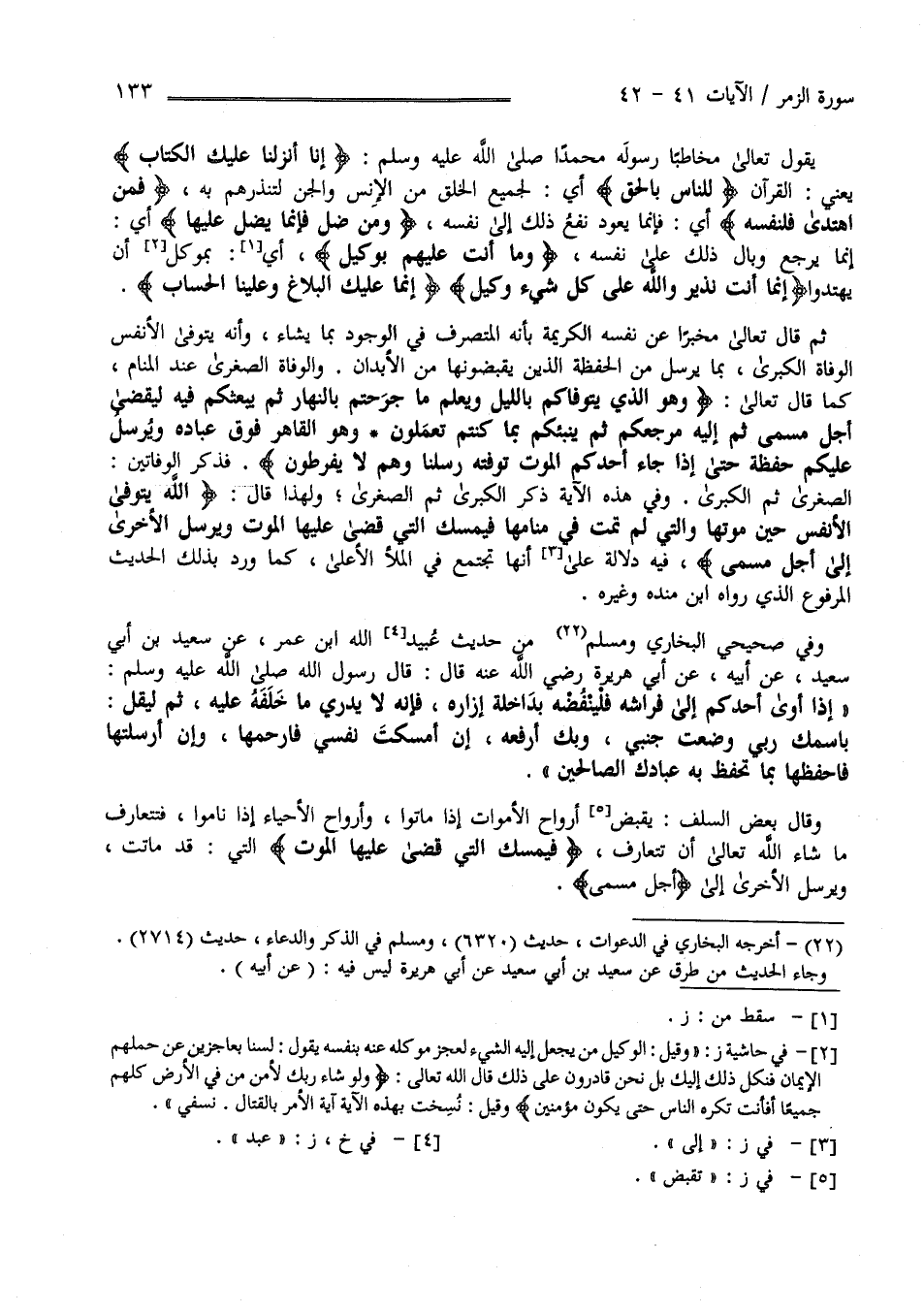 ثُمَّ قَالَ تَعَالَى مُخْبِرًا عَنْ نَفْسه الْكَرِيمَة بِأَنَّهُ الْمُتَصَرِّف فِي الْوُجُود بِمَا يَشَاء وَأَنَّهُ يَتَوَفَّى الْأَنْفُس الْوَفَاة الْكُبْرَى بِمَا يُرْسِل مِنْ الْحَفَظَة الَّذِينَ يَقْبِضُونَهَا مِنْ الْأَبَدَانِ وَالْوَفَاة الصُّغْرَى عِنْد الْمَنَام كَمَا قَالَ تَبَارَكَ وَتَعَالَى " وَهُوَ الَّذِي يَتَوَفَّاكُمْ بِاللَّيْلِ وَيَعْلَم مَا جَرَحْتُمْ بِالنَّهَارِ ثُمَّ يَبْعَثُكُمْ فِيهِ لِيُقْضَى أَجَل مُسَمًّى ثُمَّ إِلَيْهِ مَرْجِعُكُمْ ثُمَّ يُنَبِّئكُمْ بِمَا كُنْتُمْ تَعْمَلُونَ وَهُوَ الْقَاهِر فَوْق عِبَاده وَيُرْسِل عَلَيْكُمْ حَفَظَة حَتَّى إِذَا جَاءَ أَحَدكُمْ الْمَوْت تَوَفَّتْهُ رُسُلنَا وَهُمْ لَا يُفَرِّطُونَ " فَذَكَرَ الْوَفَاتَيْنِ الصُّغْرَى ثُمَّ الْكُبْرَى وَفِي هَذِهِ الْآيَة ذَكَرَ الْكُبْرَى ثُمَّ الصُّغْرَى وَلِهَذَا قَالَ تَبَارَكَ وَتَعَالَى " اللَّه يَتَوَفَّى الْأَنْفُس حِين مَوْتهَا وَاَلَّتِي لَمْ تَمُتْ فِي مَنَامهَا فَيُمْسِك الَّتِي قَضَى عَلَيْهَا الْمَوْت وَيُرْسِل الْأُخْرَى إِلَى أَجَل مُسَمًّى " فِيهِ دَلَالَة عَلَى أَنَّهَا تَجْتَمِع فِي الْمَلَإِ الْأَعْلَى كَمَا وَرَدَ بِذَلِكَ الْحَدِيث الْمَرْفُوع الَّذِي رَوَاهُ اِبْن مَنْدَهْ وَغَيْره وَفِي صَحِيحَيْ الْبُخَارِيّ وَمُسْلِم مِنْ حَدِيث عُبَيْد اللَّه بْن عُمَر عَنْ سَعِيد بْن أَبِي سَعِيد عَنْ أَبِيهِ عَنْ أَبِي هُرَيْرَة رَضِيَ اللَّه عَنْهُ قَالَ : قَالَ رَسُول اللَّه صَلَّى اللَّه عَلَيْهِ وَسَلَّمَ " إِذَا أَوَى أَحَدكُمْ إِلَى فِرَاشه فَلْيَنْفُضْهُ بِدَاخِلَةِ إِزَاره فَإِنَّهُ لَا يَدْرِي مَا خَلَفَهُ عَلَيْهِ ثُمَّ لِيَقُلْ بِاسْمِك رَبِّي وَضَعْت جَنْبِي وَبِك أَرْفَعُهُ إِنْ أَمْسَكْت نَفْسِي فَارْحَمْهَا وَإِنْ أَرْسَلْتهَا فَاحْفَظْهَا بِمَا تَحْفَظ بِهِ عِبَادك الصَّالِحِينَ " وَقَالَ بَعْض السَّلَف يُقْبَض أَرْوَاح الْأَمْوَات إِذَا مَاتُوا وَأَرْوَاح الْأَحْيَاء إِذَا نَامُوا فَتَتَعَارَف مَا شَاءَ اللَّه تَعَالَى أَنْ تَتَعَارَف " فَيُمْسِك الَّتِي قَضَى عَلَيْهَا الْمَوْت" الَّتِي قَدْ مَاتَتْ وَيُرْسِل الْأُخْرَى إِلَى أَجَل مُسَمًّى