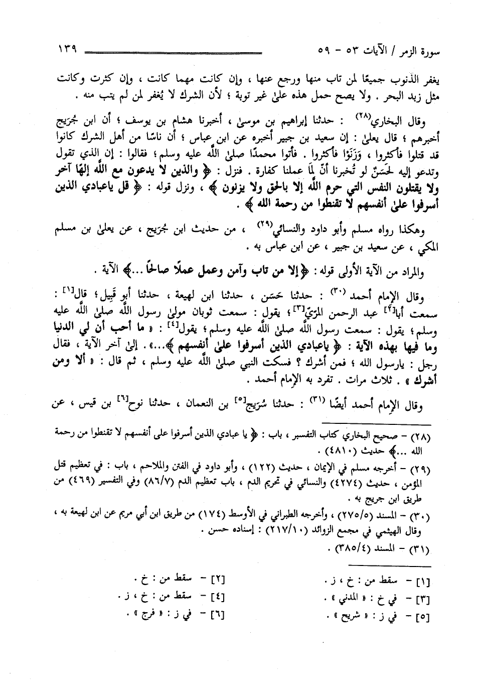 قَالَ الْبُخَارِيّ حَدَّثَنَا إِبْرَاهِيم بْن مُوسَى أَخْبَرَنَا هِشَام بْن يُوسُف أَنَّ اِبْن جُرَيْج أَخْبَرَهُمْ قَالَ يَعْلَى إِنَّ سَعِيد بْن جُبَيْر أَخْبَرَهُ عَنْ اِبْن عَبَّاس رَضِيَ اللَّه عَنْهُمَا أَنَّ نَاسًا مِنْ أَهْل الشِّرْك كَانُوا قَدْ قَتَلُوا فَأَكْثَرُوا وَزَنَوْا فَأَكْثَرُوا فَأَتَوْا مُحَمَّدًا صَلَّى اللَّه عَلَيْهِ وَسَلَّمَ فَقَالُوا إِنَّ الَّذِي تَقُول وَتَدْعُو إِلَيْهِ لَحَسَنٌ لَوْ تُخْبِرنَا أَنَّ لِمَا عَمِلْنَا كَفَّارَة فَنَزَلَ" وَاَلَّذِينَ لَا يَدْعُونَ مَعَ اللَّه إِلَهًا آخَر وَلَا يَقْتُلُونَ النَّفْس الَّتِي حَرَّمَ اللَّه إِلَّا بِالْحَقِّ وَلَا يَزْنُونَ " وَنَزَلَ " قُلْ يَا عِبَادِيَ الَّذِينَ أَسْرَفُوا عَلَى أَنْفُسهمْ لَا تَقْنَطُوا مِنْ رَحْمَة اللَّه " وَهَكَذَا رَوَاهُ مُسْلِم وَأَبُو دَاوُد وَالنَّسَائِيّ مِنْ حَدِيث اِبْن جُرَيْج عَنْ يَعْلَى بْن مُسْلِم الْمَكِّيّ عَنْ سَعِيد بْن جُبَيْر عَنْ اِبْن عَبَّاس رَضِيَ اللَّه عَنْهُمَا بِهِ .
